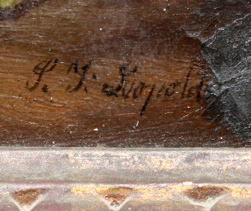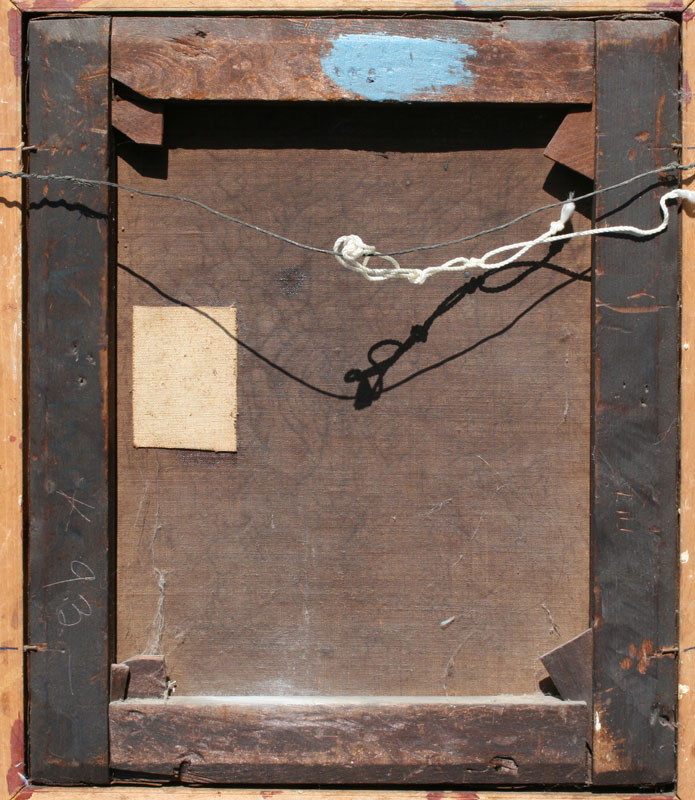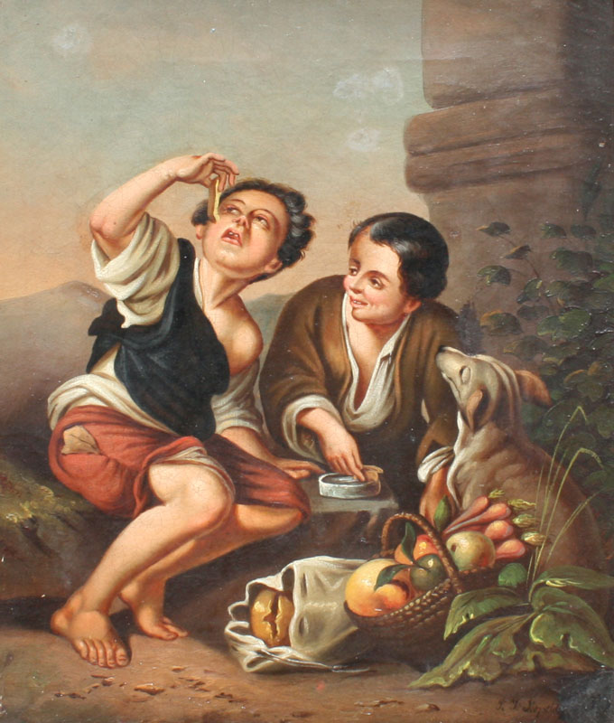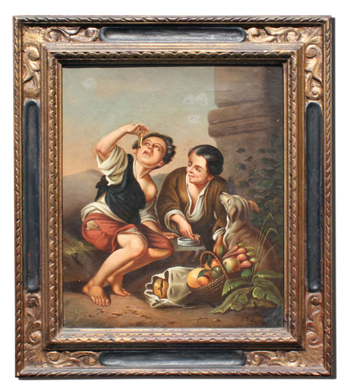 19TH CENTURY GENRE SCENE WITH TRAVELERS RESTING & EATING WITH FAITHFUL DOG BEGGING FOR FOOD: OIL/Canvas, 14'' x 11 3/4'', carved and gilded frame, 19'' x 16 1/2''.