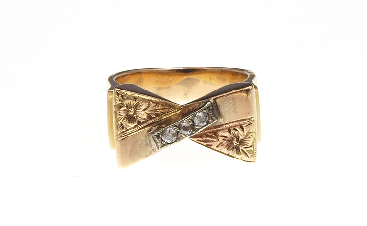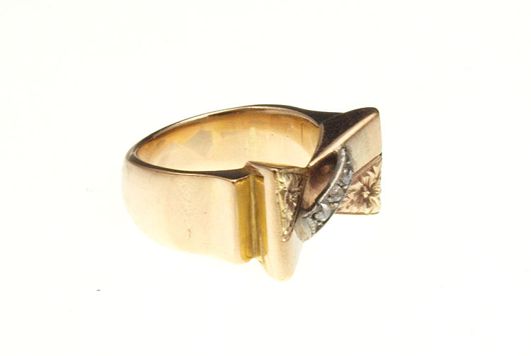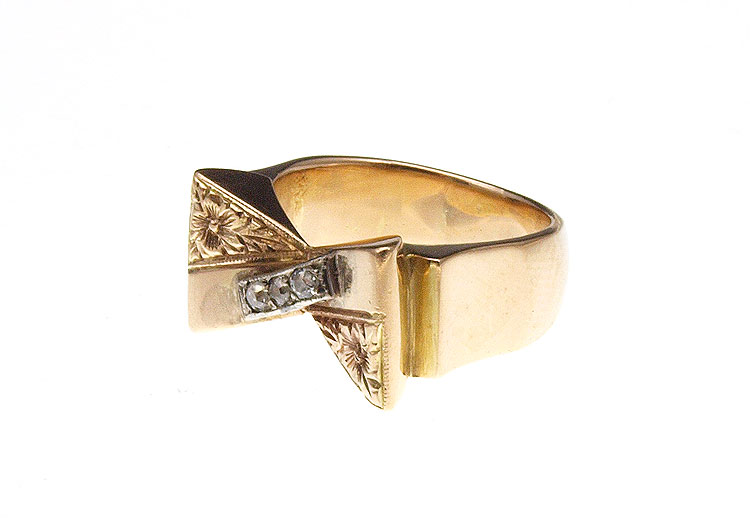 14K DIAMOND RING: 14K yellow gold ring contains three early single cut diamonds. WEIGHT: .10 Ct. Approx. The diamonds are prong set. Weight:9.7 grams. Size: 4.5