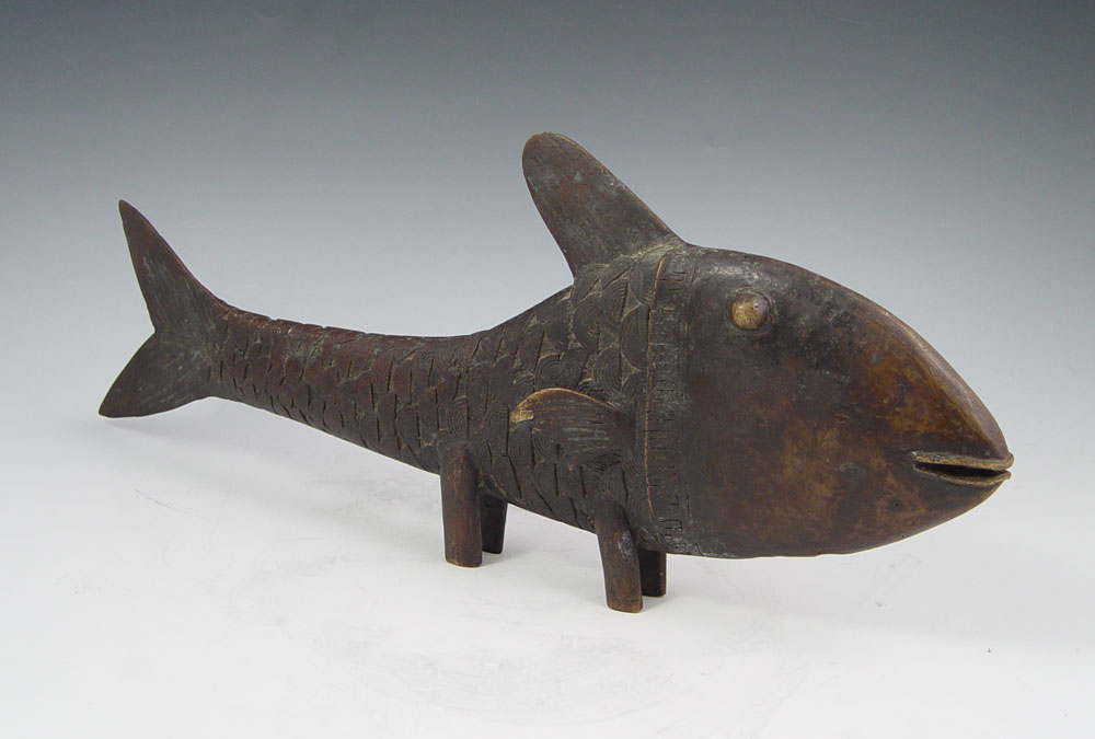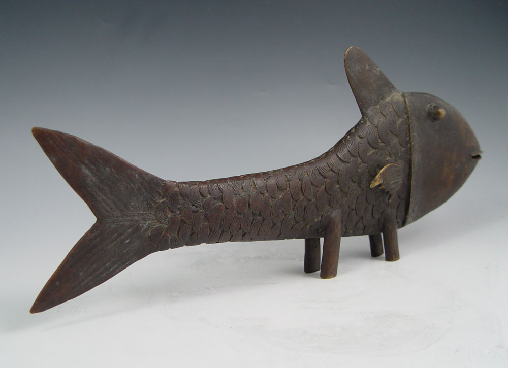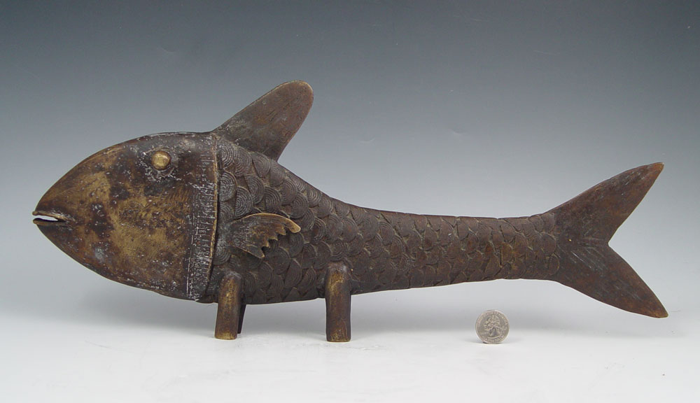 WEST AFRICAN BRONZE FISH SCULPTURE: Most likely Benin tribe. 20th Century. 7'' h. x 17 3/4'' x 1 1/2''.