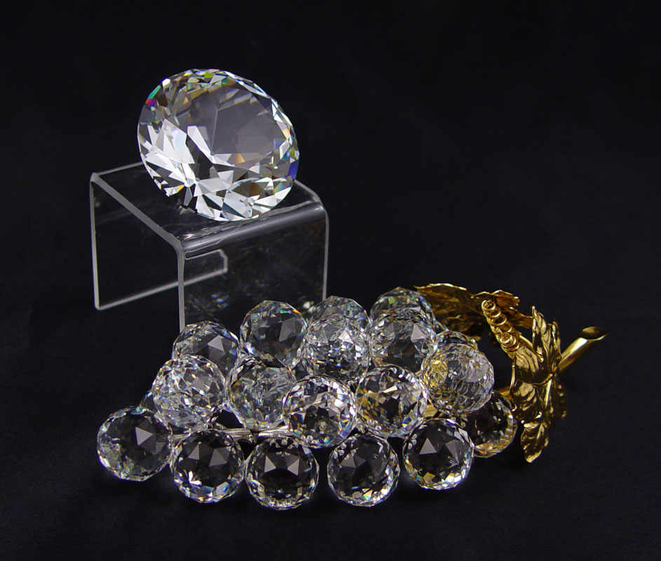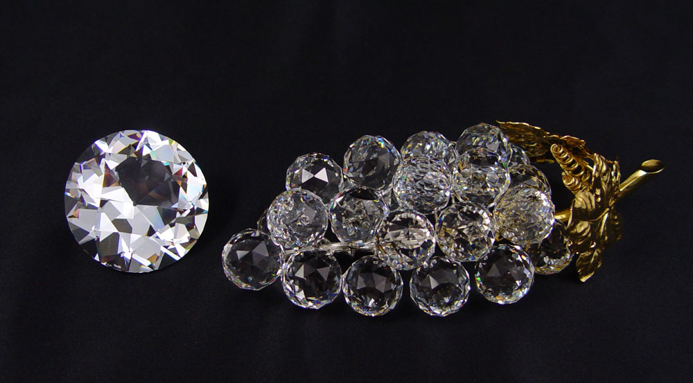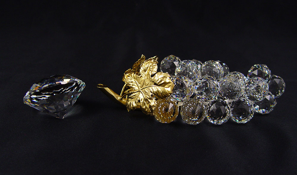 SWAROVSKI CRYSTAL GRAPES AND DIAMOND PAPERWEIGHT: Cluster of Grapes, from the Sparkling Fruit Collection, retired, 6''l., with original box; and a Diamond Paperweight, 2''dia., with large replacement box. Sold as a lot.