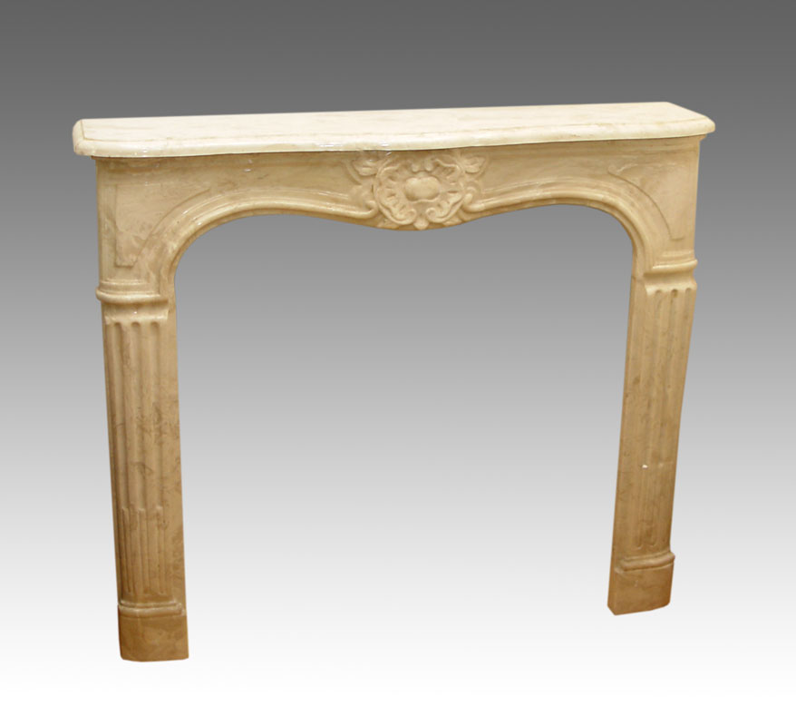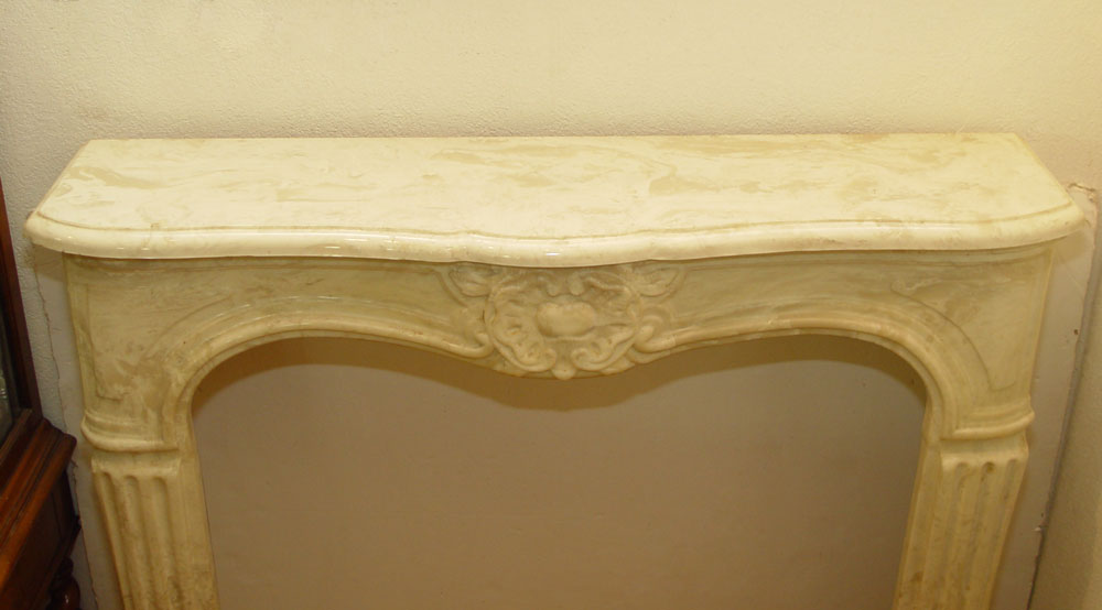 CARVED MARBLE FIREPLACE MANTLE AND SURROUND: Serpentine front with carved decoration, carved fluted surround. 43 1/8'' h. x 51'' x 12 3/4''.