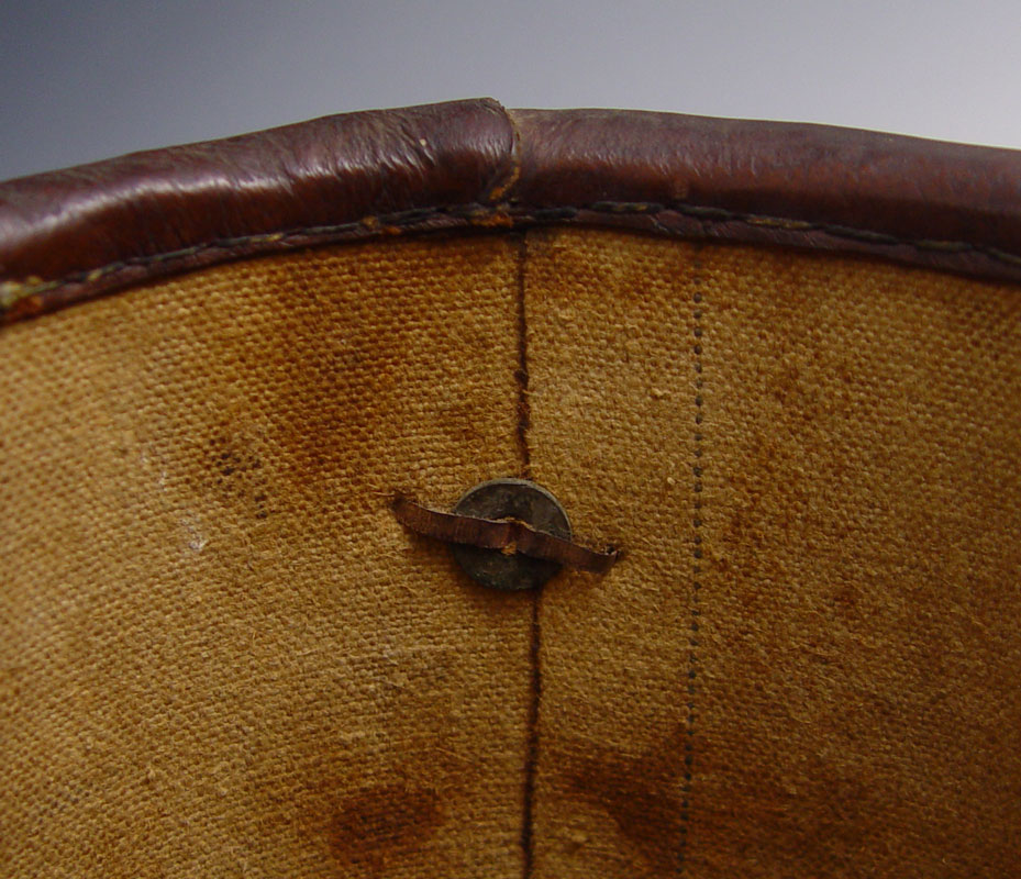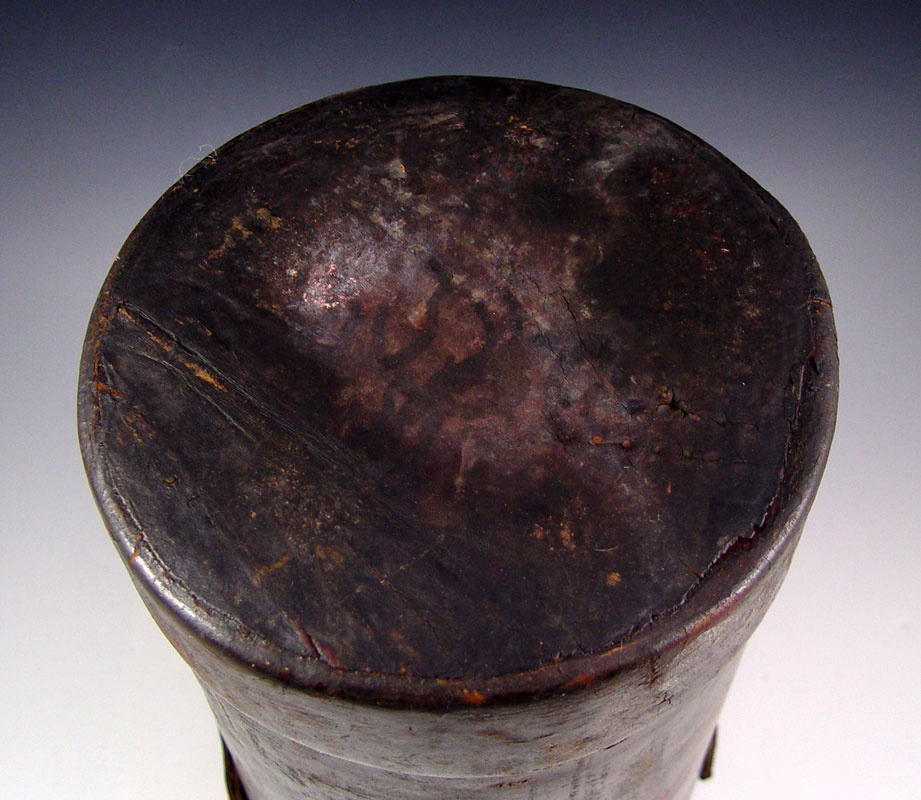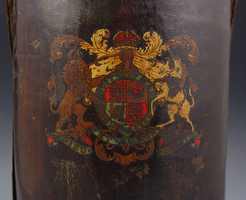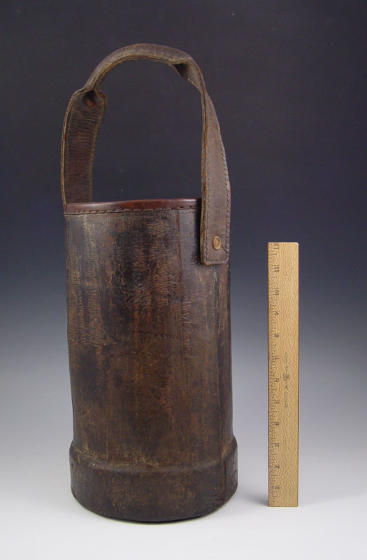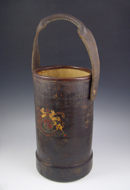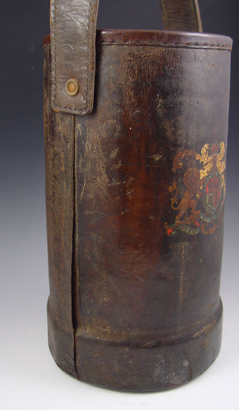 ENGLISH LEATHER FIRE BUCKET: With English crest and motto. Original handle attached. 13 3/4'' h. x 8''.