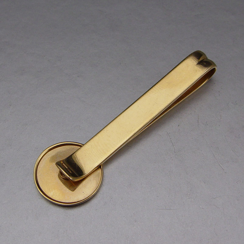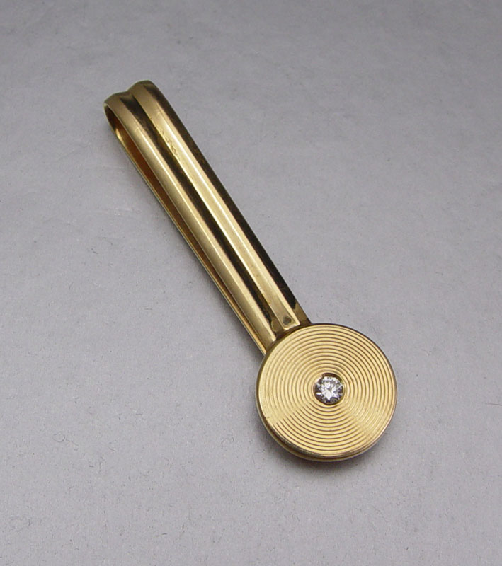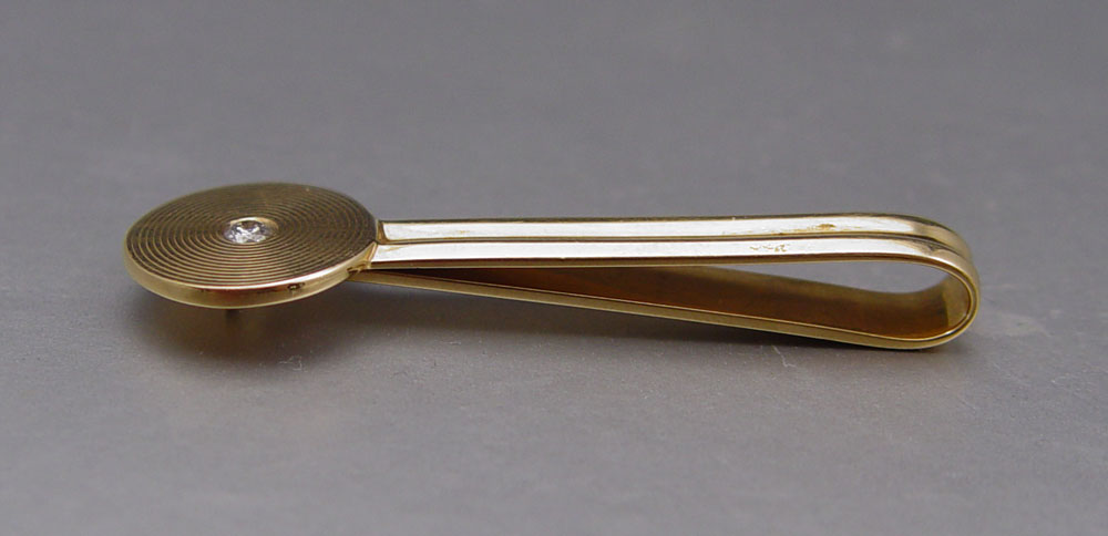 14K GOLD DIAMOND TIE BAR: 14K yellow gold tie bar contains one round brilliant cut diamond. WEIGHT: .12 Ct. Approx. Rated VS in clarity and G-H in color. The diamond is bezel set. Weight: 8.0 grams.
