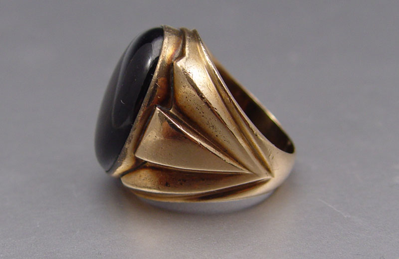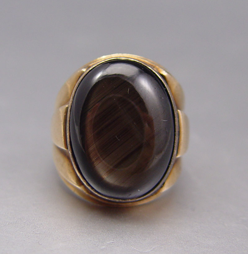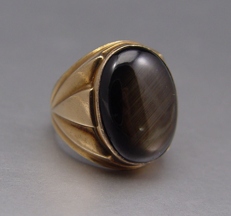 20 CT. BLACK STAR SAPPHIRE RING: 14K yellow gold ring contains one oval shaped cabochon cut black star sapphire. Weight: 20.00 Ct. Approx. Off center star. The sapphire is bezel set. Weight: 14.0 grams Approx. Size: 8.5
