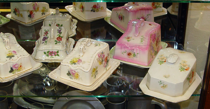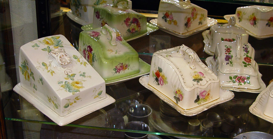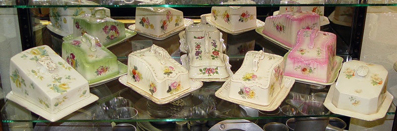 COLLECTION OF 7 GERMAN & ENGLISH CHEESE DISHES: All with floral and gold accent decoration. To include John Maddock & Son, S. Johnson Britannia Pottery, Winton, 4 Franz Anton Mehlem. Largest measures 5'' h. x 9'' x 6 1/2''.