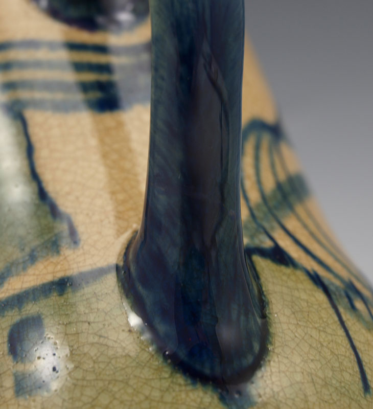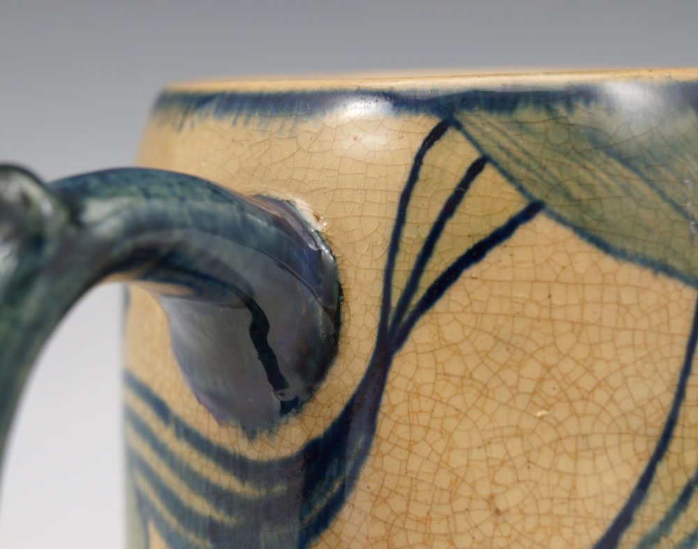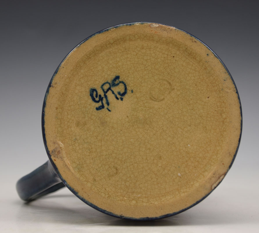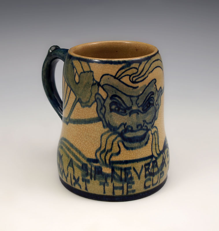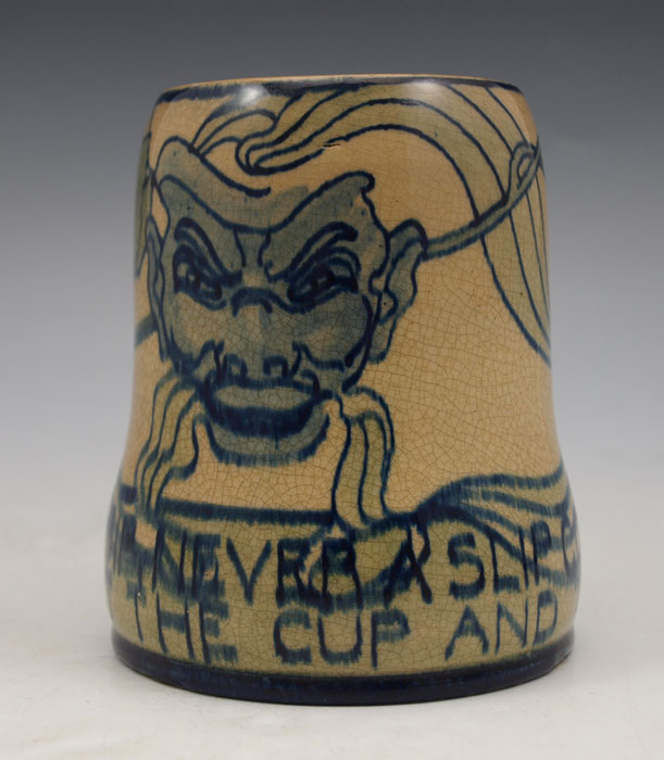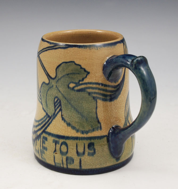 NEWCOMB COLLEGE POTTERY MUG: Decorated by Gertrude Roberts Smith, faculty member art instructor at Newcomb College 1887-1894. NC impression visible, G.R.S. under glaze, 4 1/2'' tall. ''Many A Sip Never a Slip Come To Us Twixt The Cup and The Lip!''