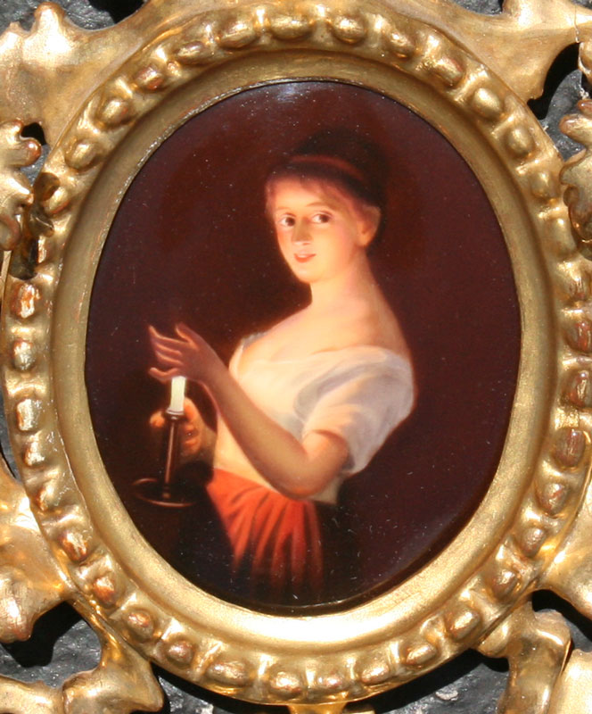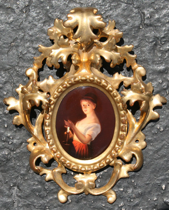 KPM QUALITY MINIATURE ON PORCELAIN OF A YOUNG MAIDEN HOLDING A CHAMBER STICK: Porcelain measures 3 1/4'' x 2 1/2'', encased in a carved and gilded gesso Italian frame, 8'' x 6 1/2''.