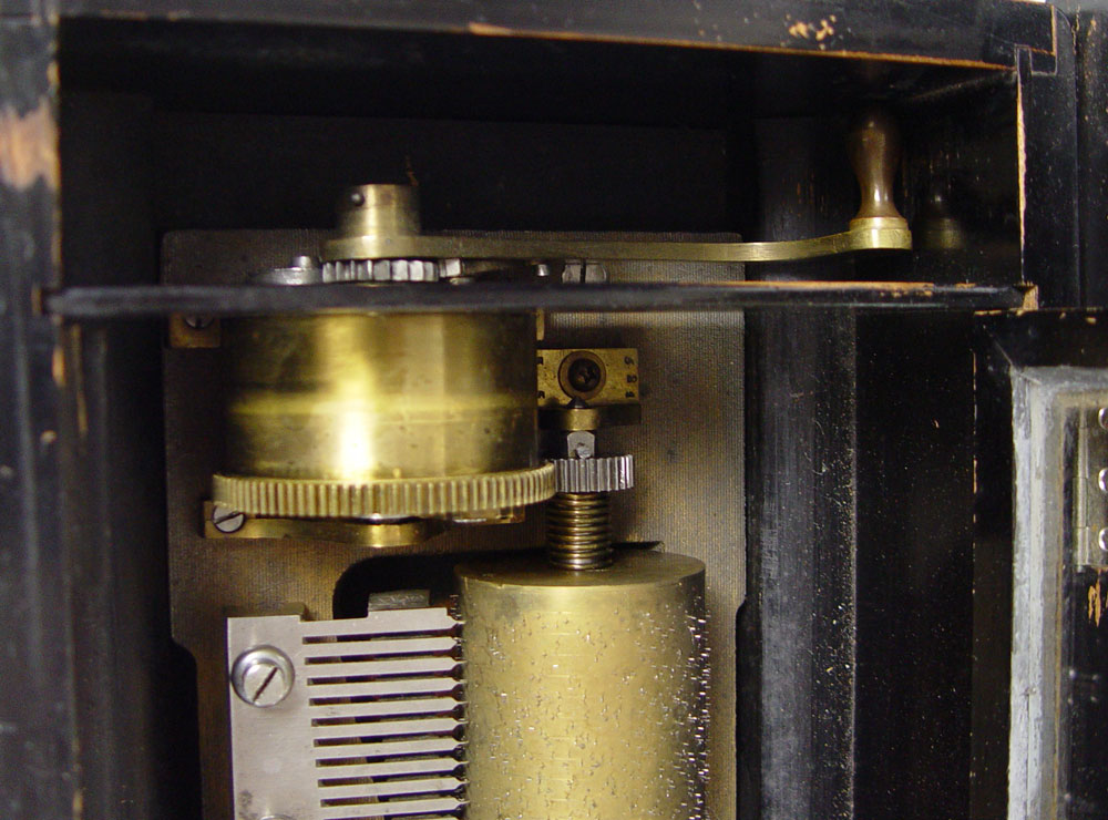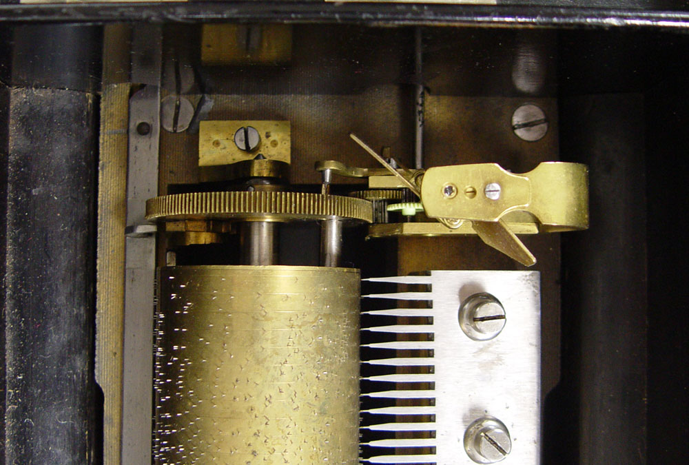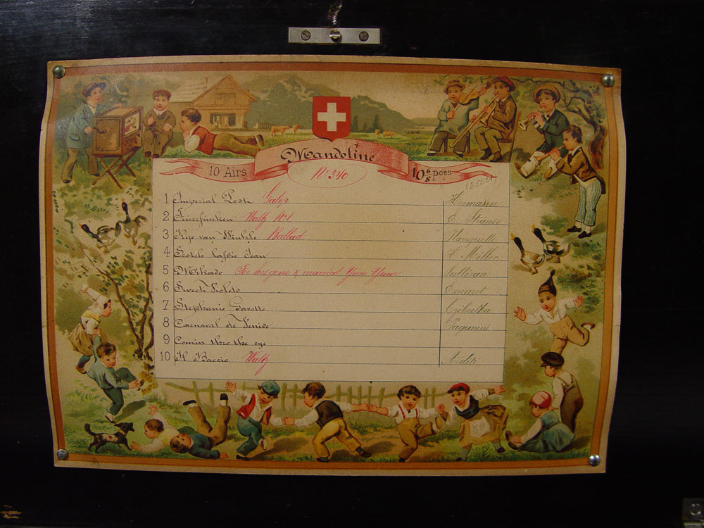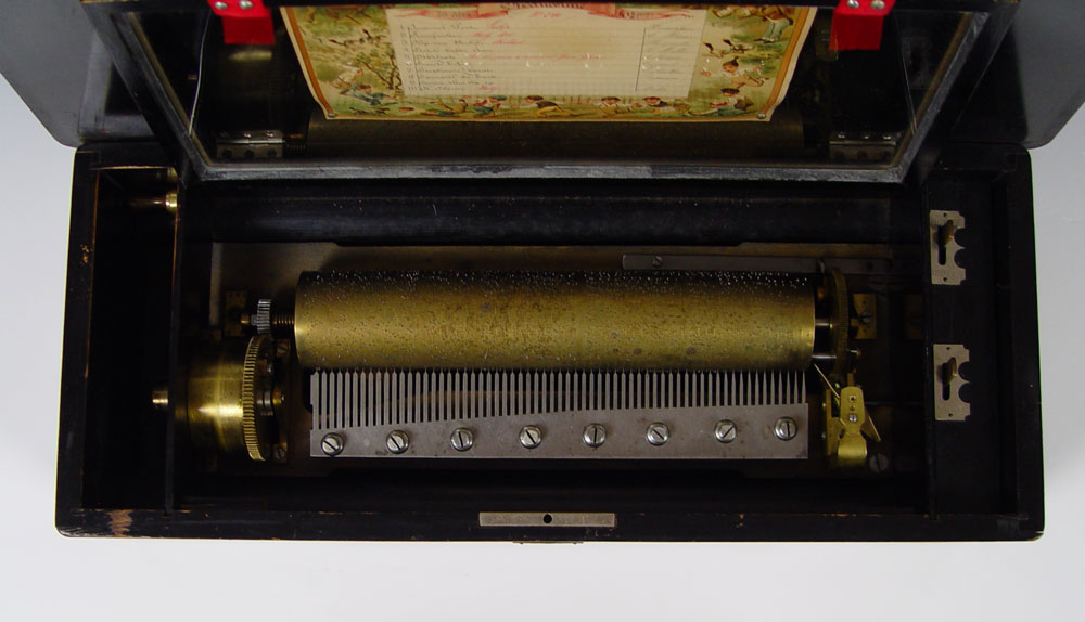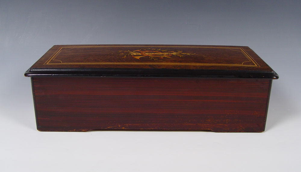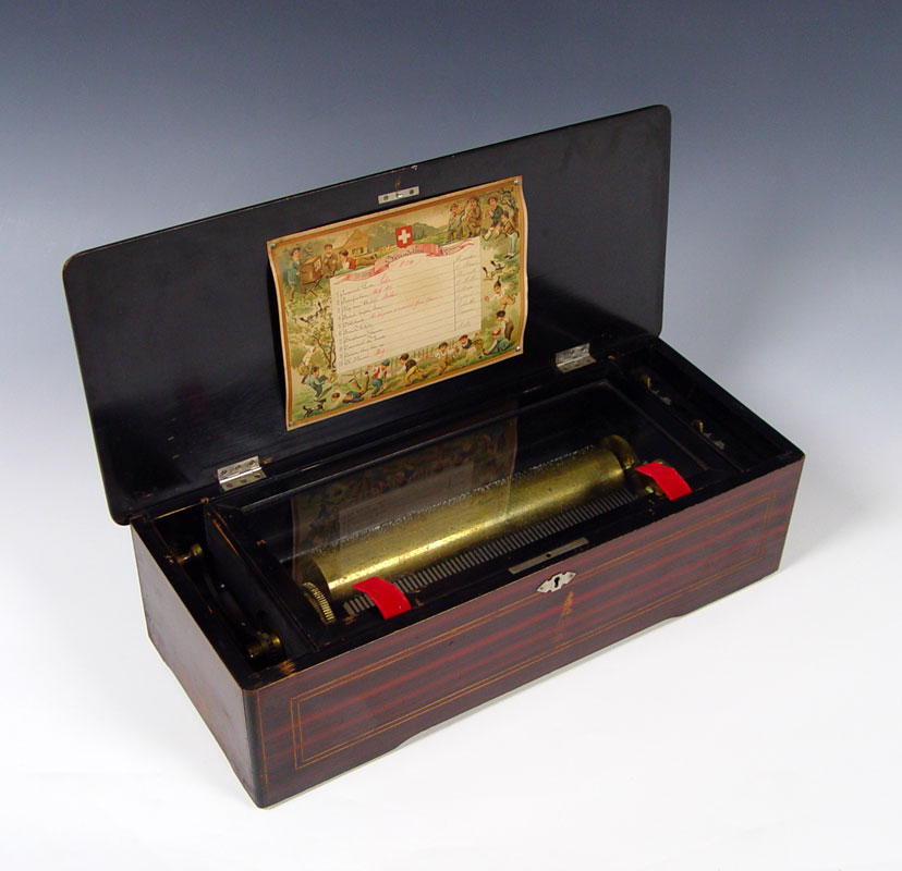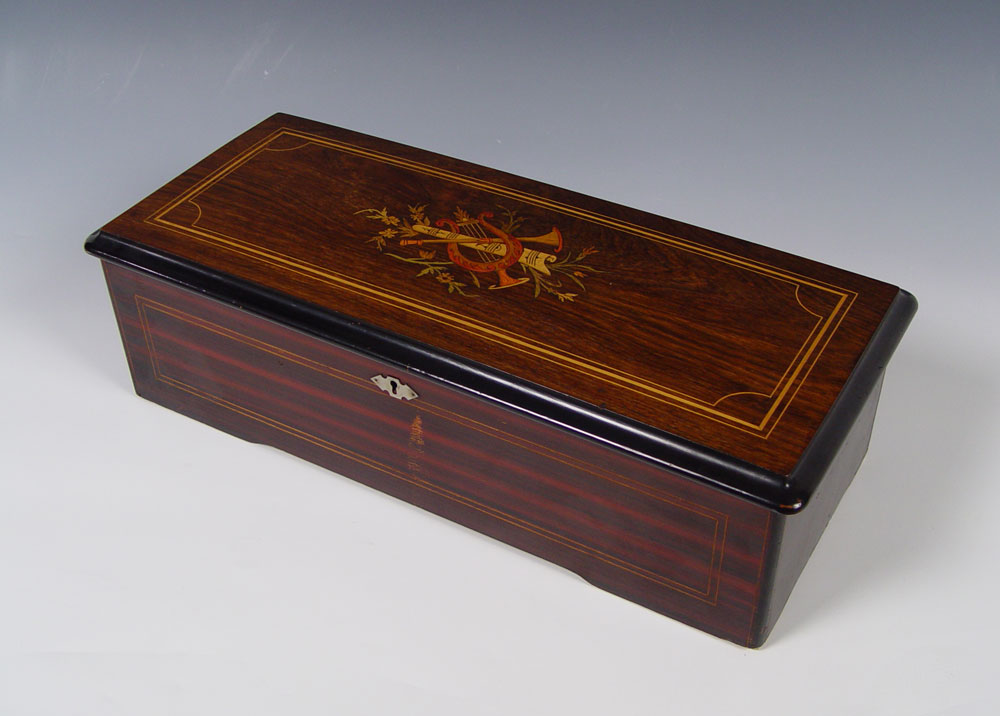 INLAY ROSEWOOD CYLINDER ROLL SWISS MUSIC BOX: String inlay with parquetry musical instruments on top. Plays 10 songs with original lithograph listing of songs under lid. Unmarked mechanism, complete with all teeth. Measures 6'' h. x 20 3/4'' x 8 7/8''.