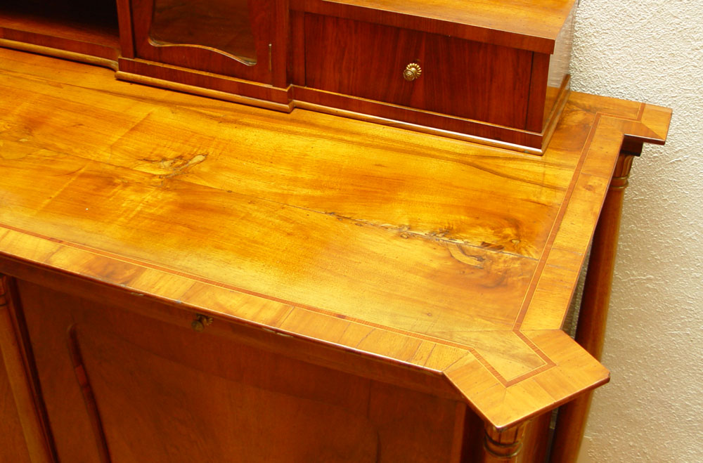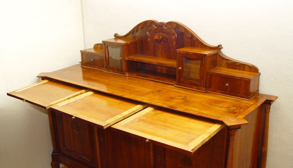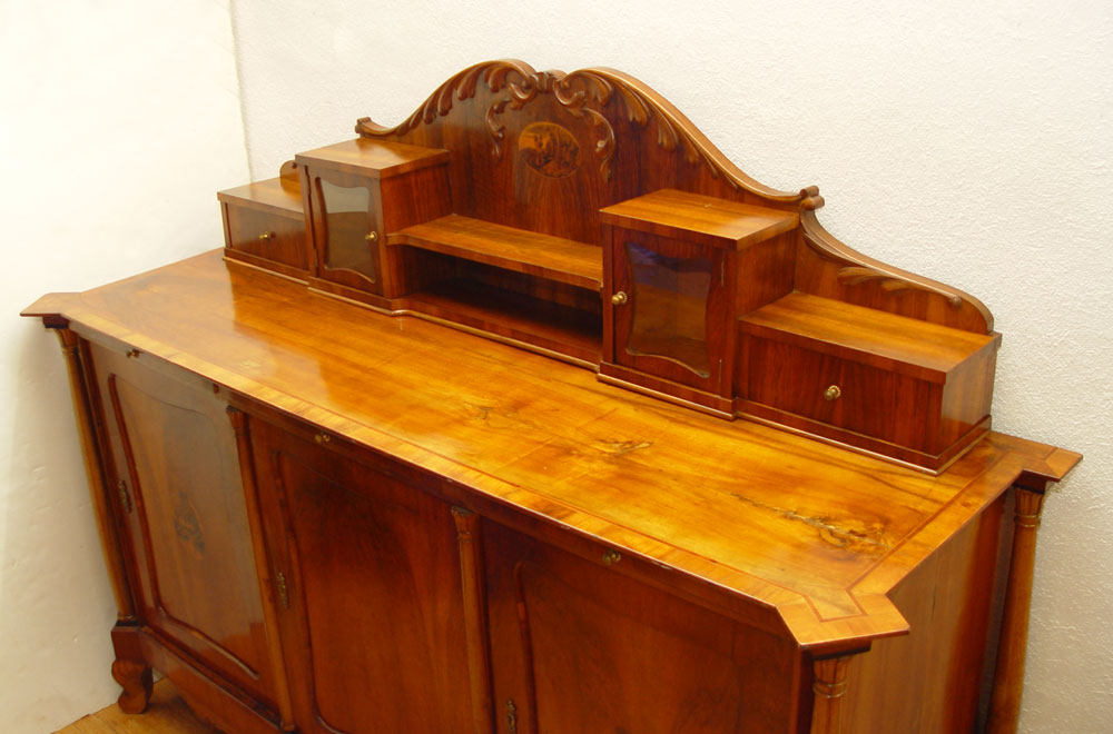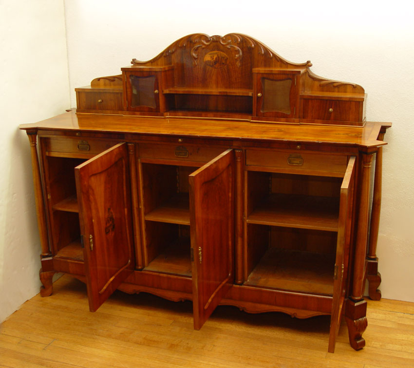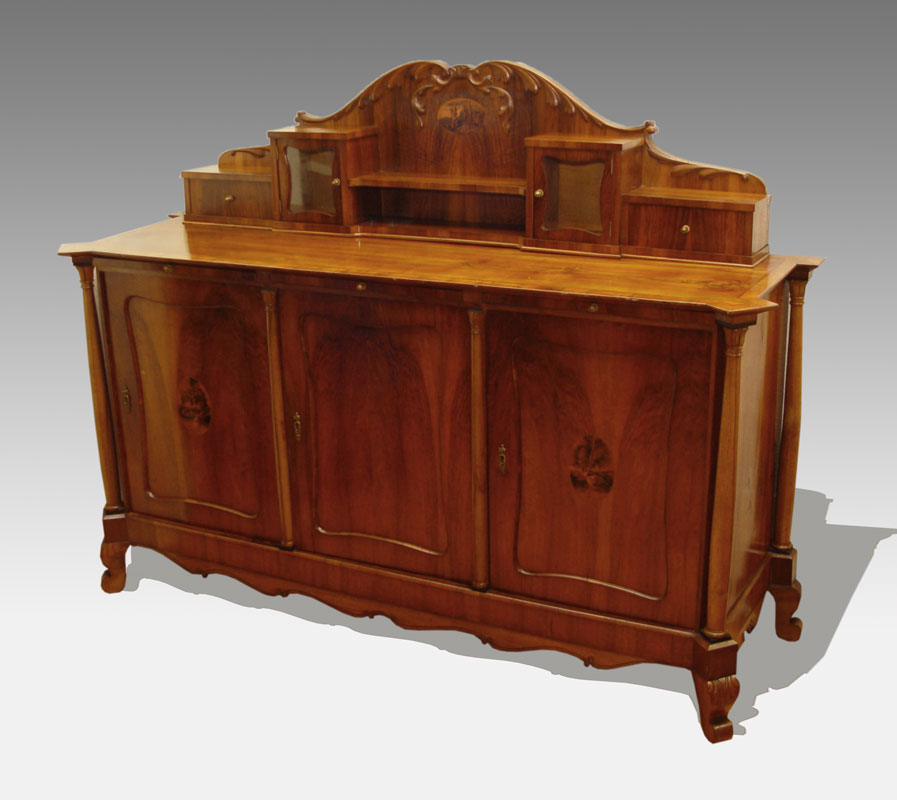 19TH CENTURY EUROPEAN CUSTOM SIDEBOARD: Pine construction with cherry veneer and line inlay top. Shaped backsplash with 2 glass display chambers and drawers. Base with 3 slide out serving shelves over 3 doors. Adjustable shelf interior. Backsplash and 2 doors have fine detailed oval inlays. 62'' h. x 81'' x 26''