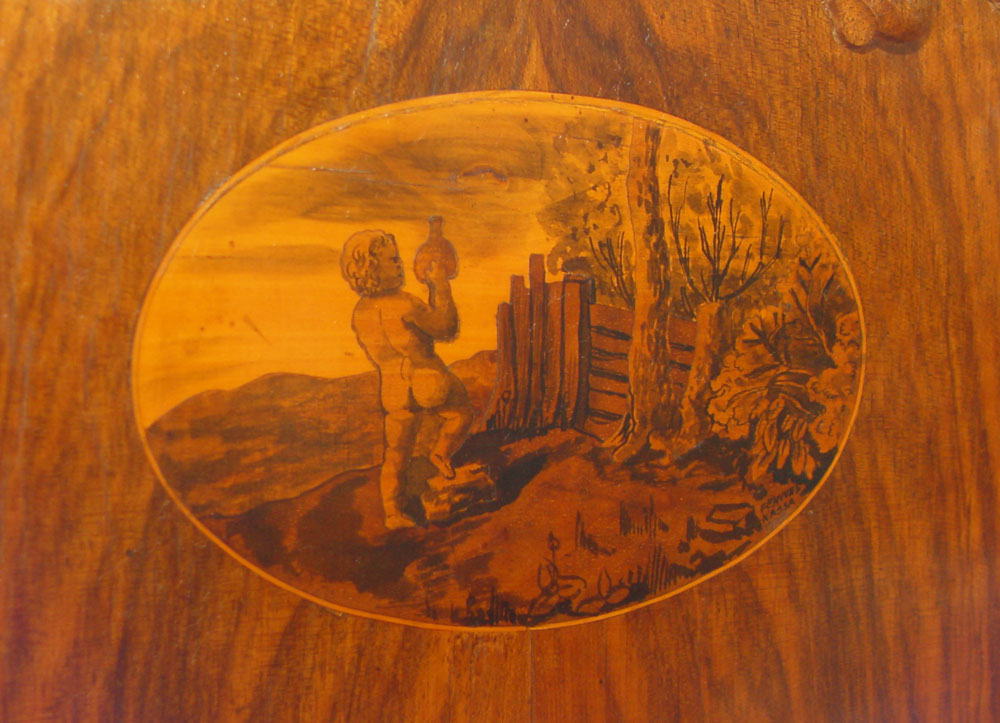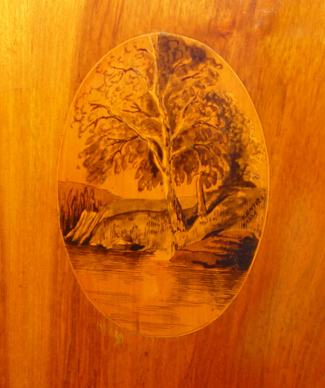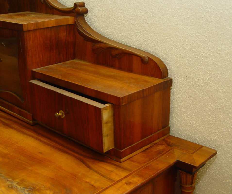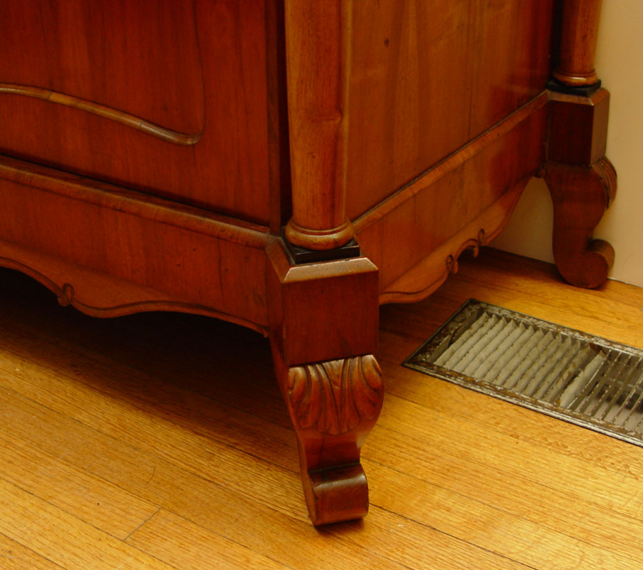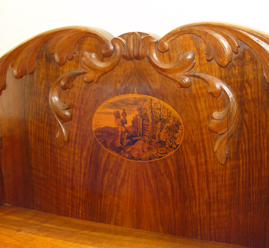 19TH CENTURY EUROPEAN CUSTOM SIDEBOARD: Pine construction with cherry veneer and line inlay top. Shaped backsplash with 2 glass display chambers and drawers. Base with 3 slide out serving shelves over 3 doors. Adjustable shelf interior. Backsplash and 2 doors have fine detailed oval inlays. 62'' h. x 81'' x 26''