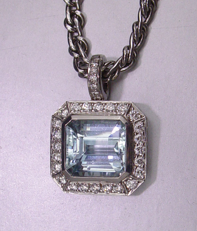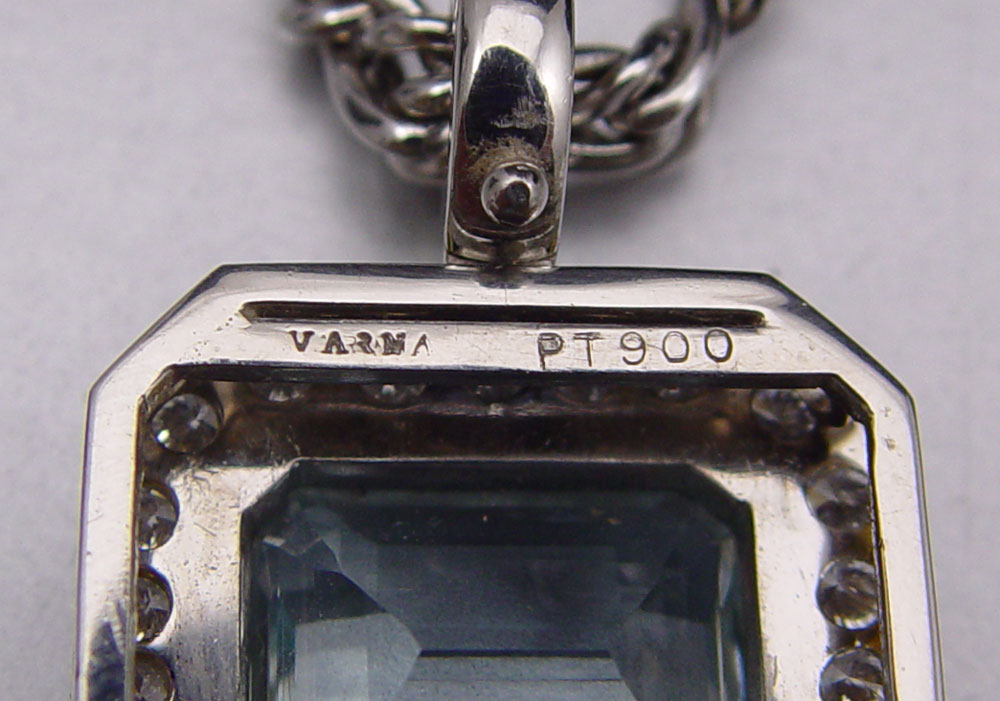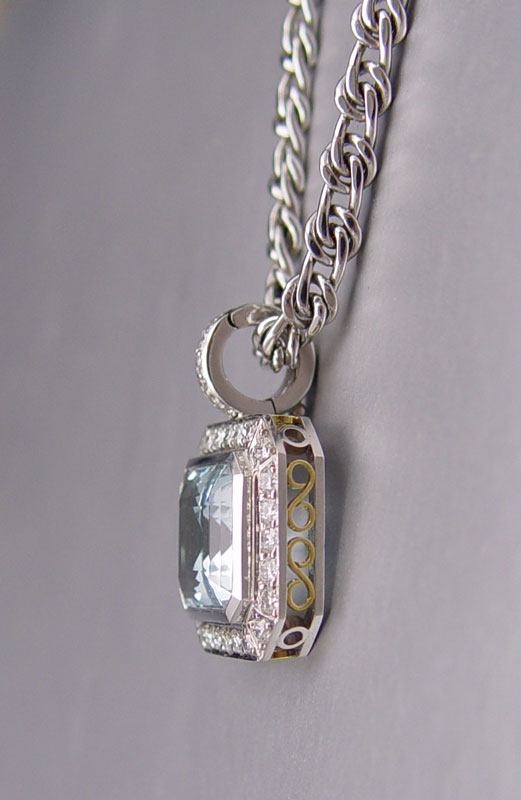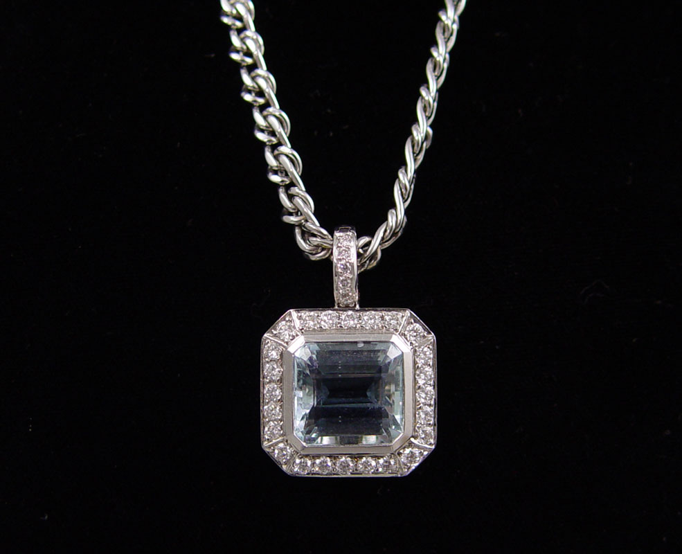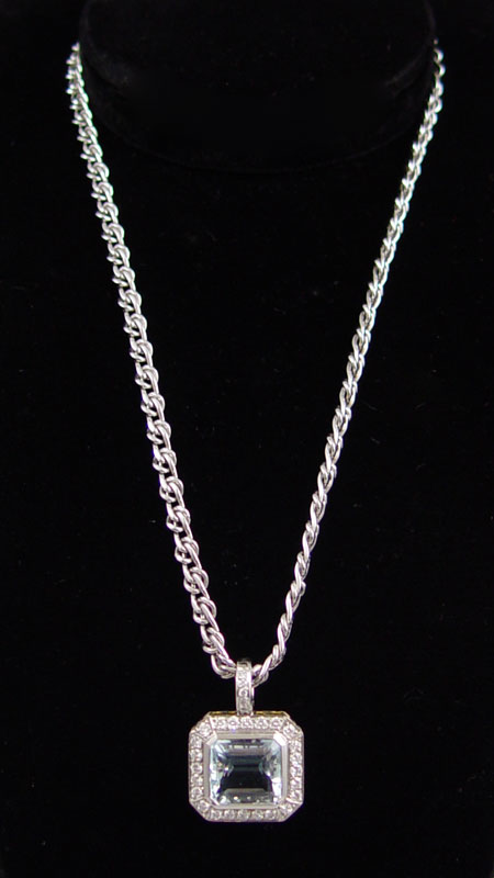 VARNA PLATINUM 9.63 CT AQUAMARINE ENHANCER PENDANT AND CHAIN NECKLACE: Platinum enhancer pendant centers an emerald cut aquamarine, approx. 9.63 Ct. VVS clarity, vslgB hue, The aqua is framed by 28 round brilliant cut diamonds, approx. 1.25Ctw., VS in clarity and G-H color. The aquamarine s bezel set. The diamonds are bead set. Signed Varna. Weight 14 grams. CHAIN is 18K white gold fancy link, 28.3 grams. Sold with current Florida Diamond Appraisers GIA graduates appraisal for $9450.