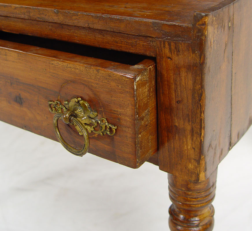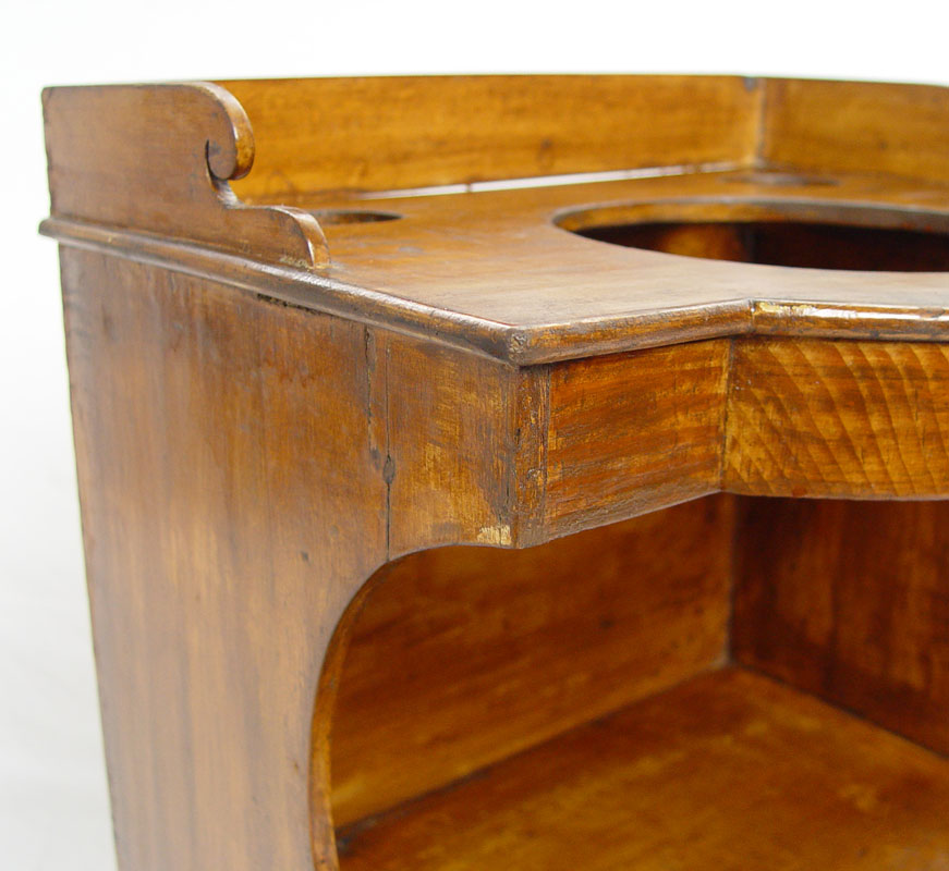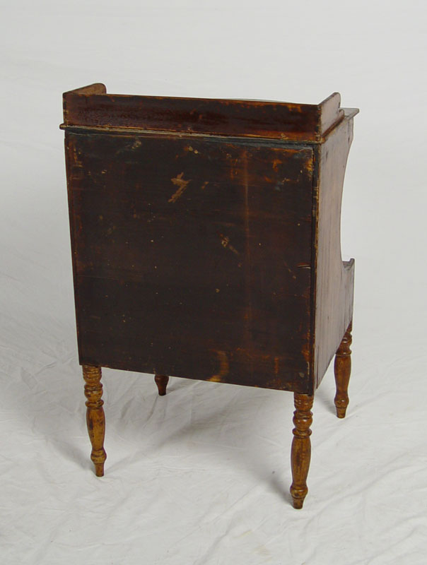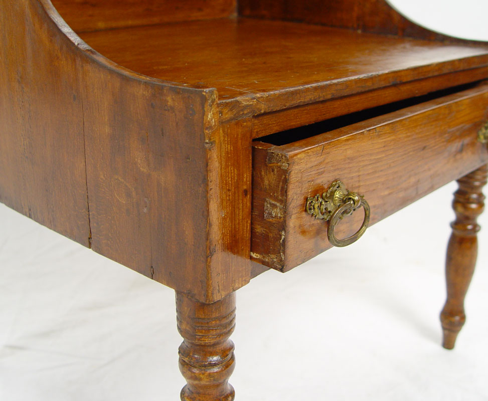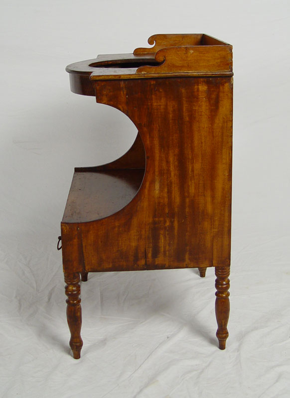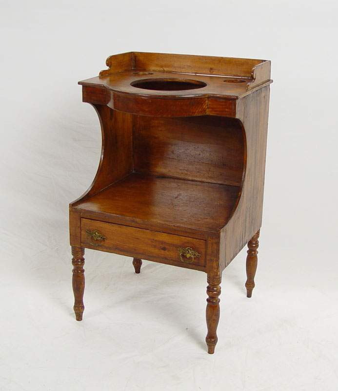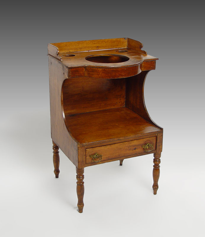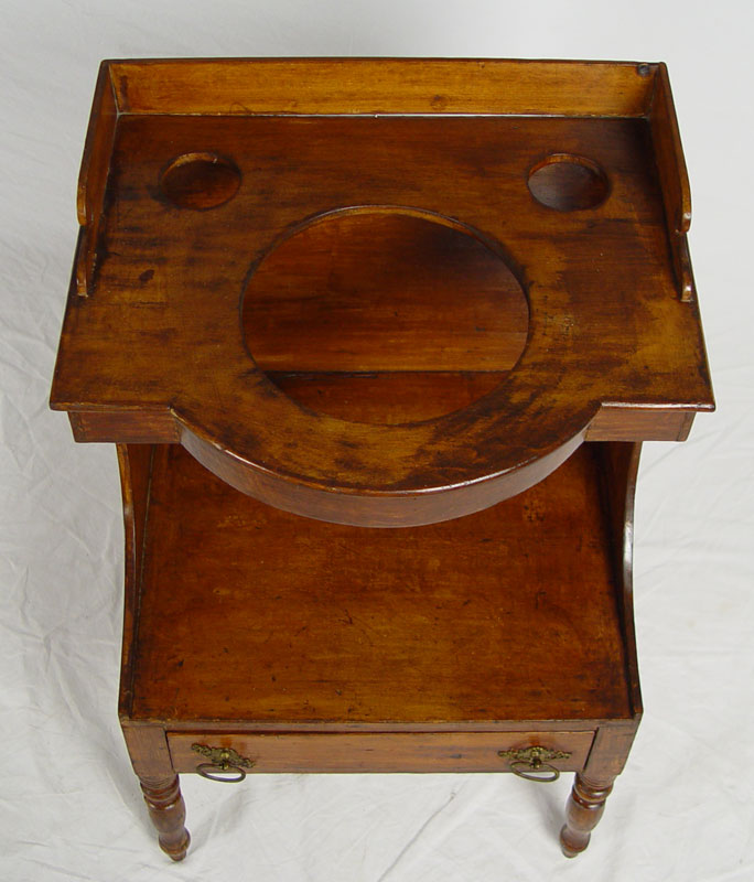 COUNTRY SHERATON WASH STAND: Edged with cup backsplash. Top equipped with cut out for pitcher and bowl and 2 glasses. Lower shelf with single drawer. Turned and capped end legs. 30 1/2'' h. x 19'' x 16''.