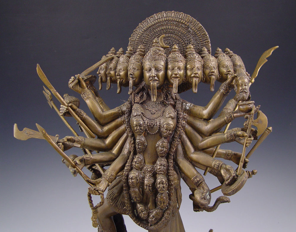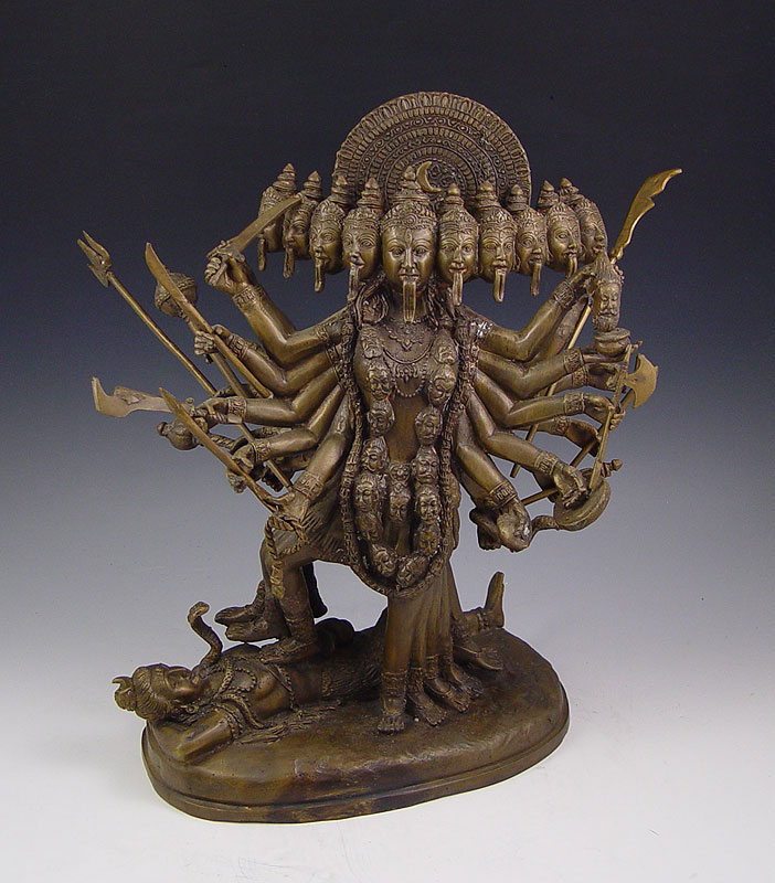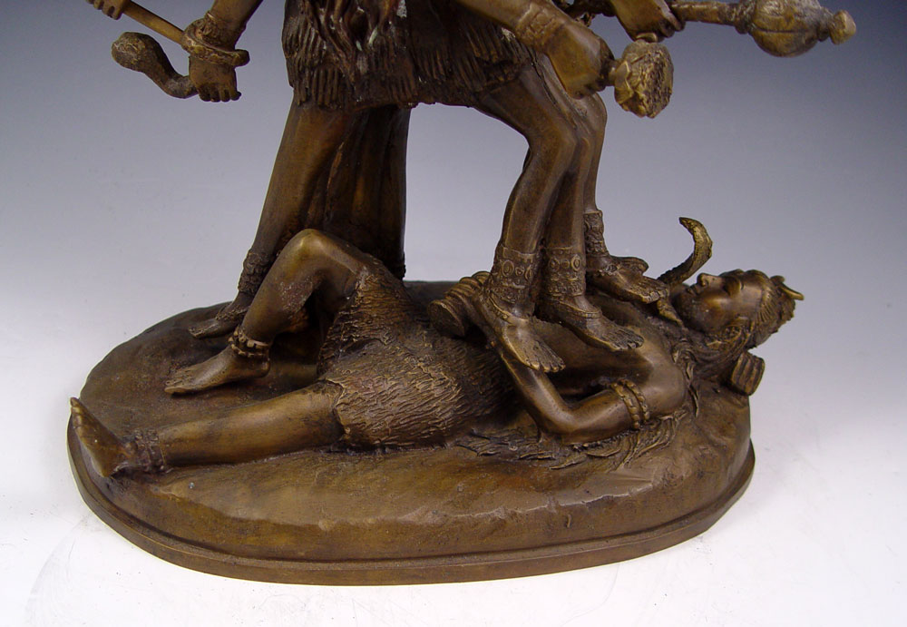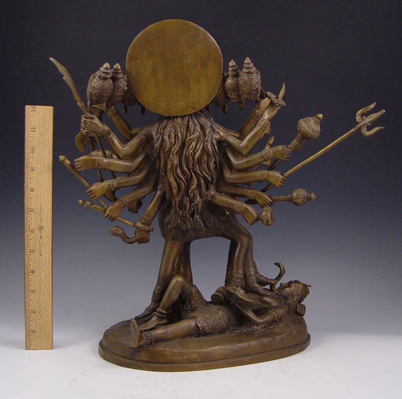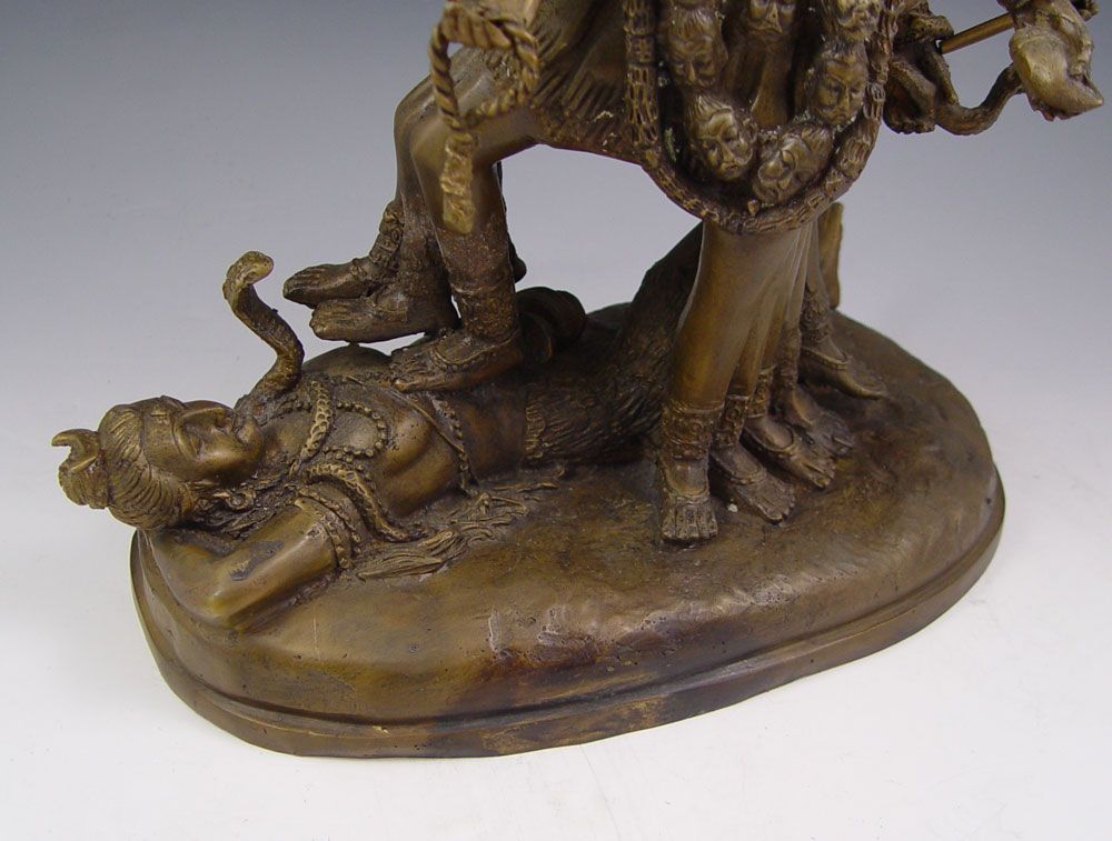 SOUTHEAST ASIAN BRONZE STATUE OF HINDU GODDESS KALI DEFEATING FEMALE OPPONENT: 16''h x 14''w x 7''d, weapons in hands of goddess are removable, age unknown.