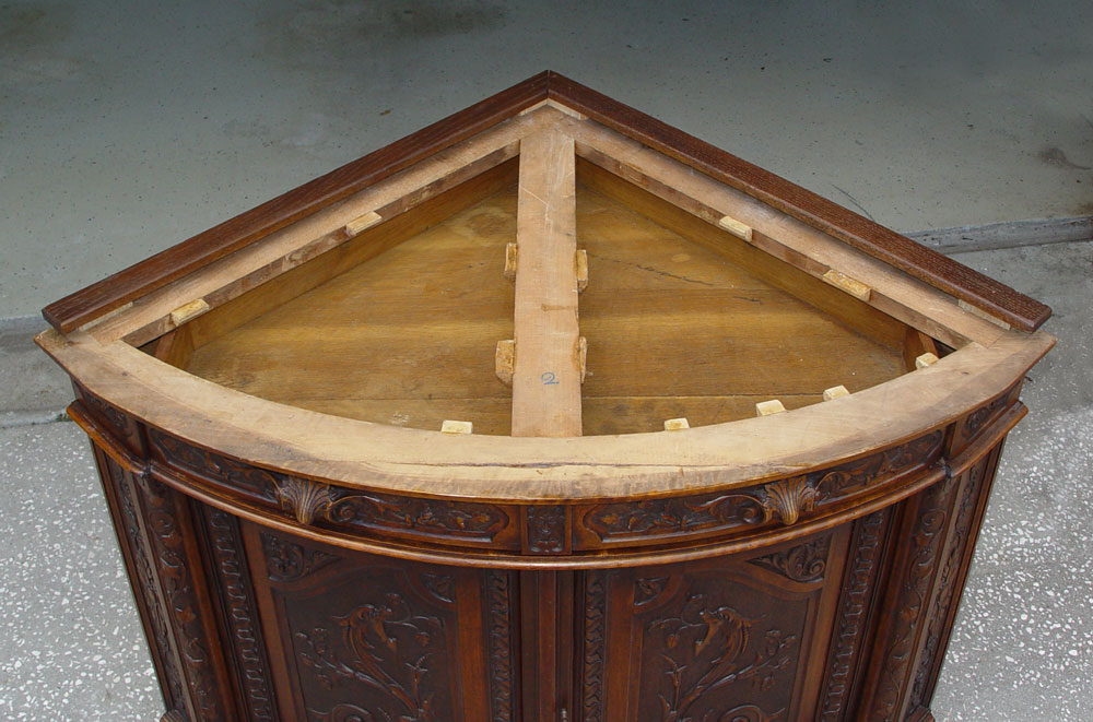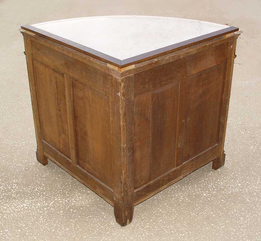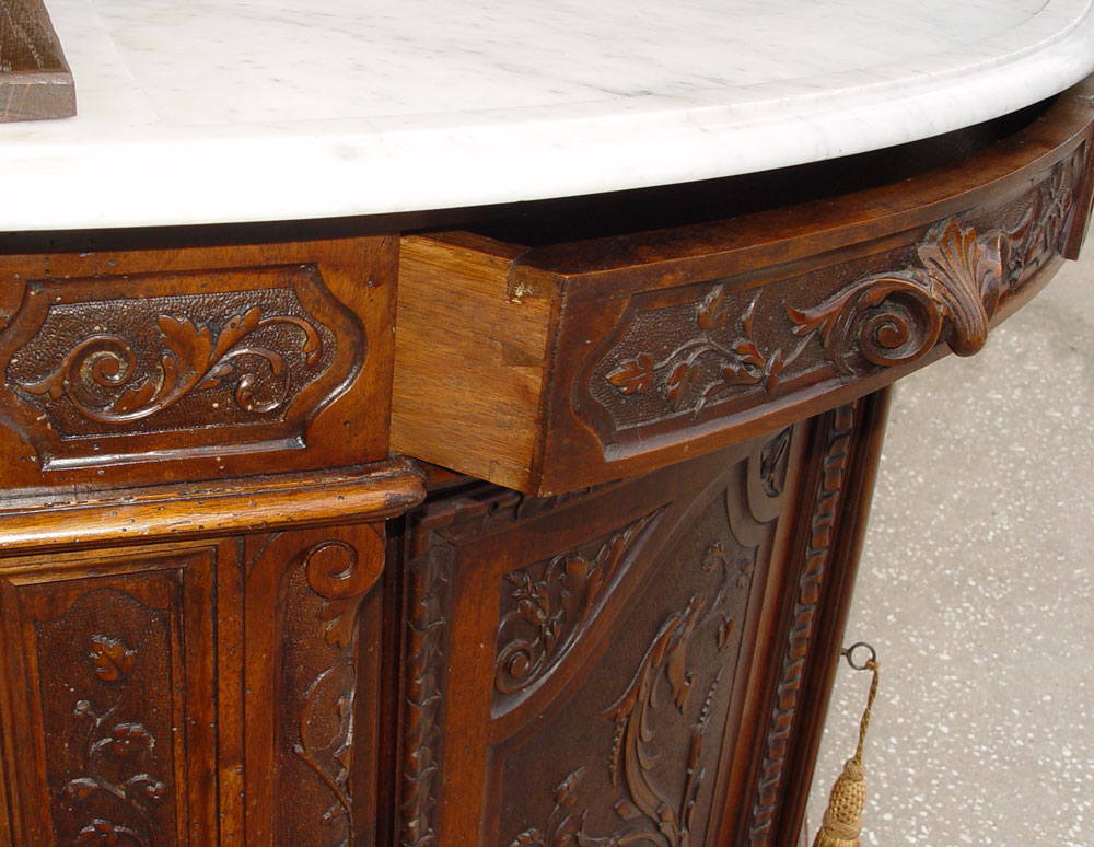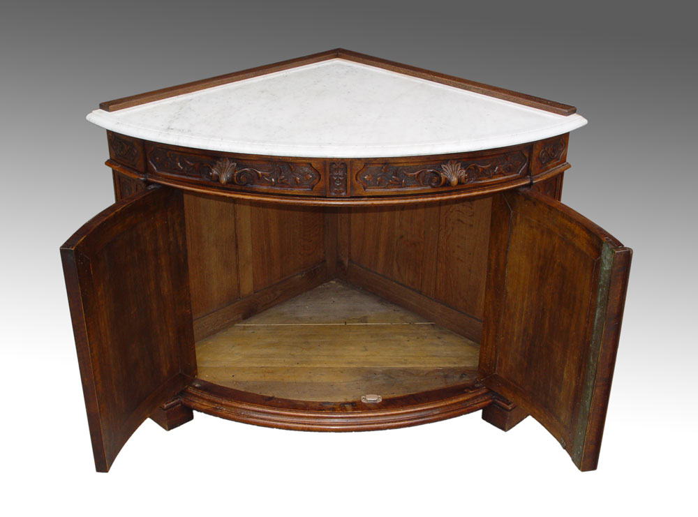 VICTORIAN CARVED OAK MARBLE TOP HORNER QUALITY CORNER COMMODE: White marble top over single drawer and 2 curved drawers. Ornately carved with serpent, ivy and leaf motif. Key locking, key included. 33'' tall x 46'' wide x 33'' deep.