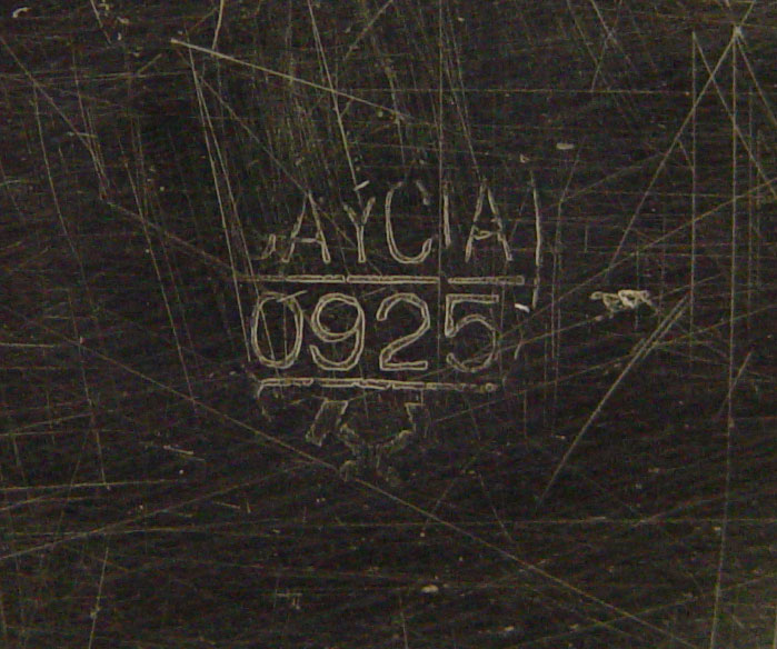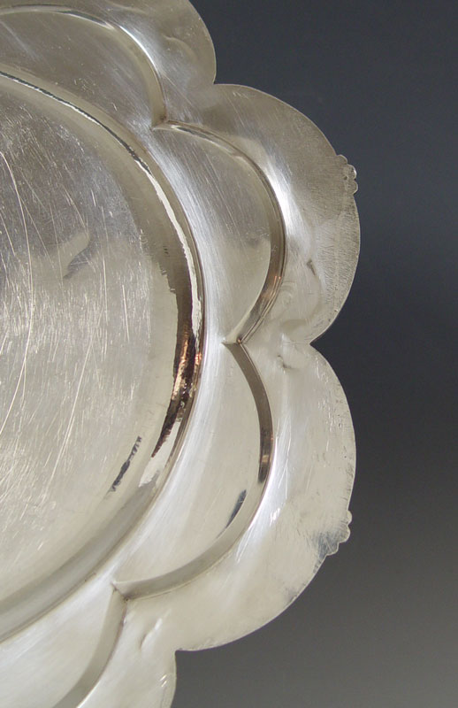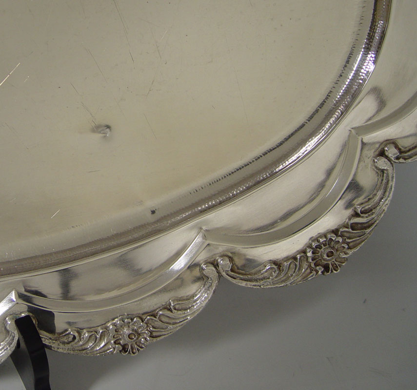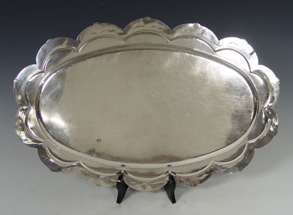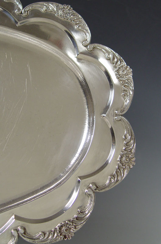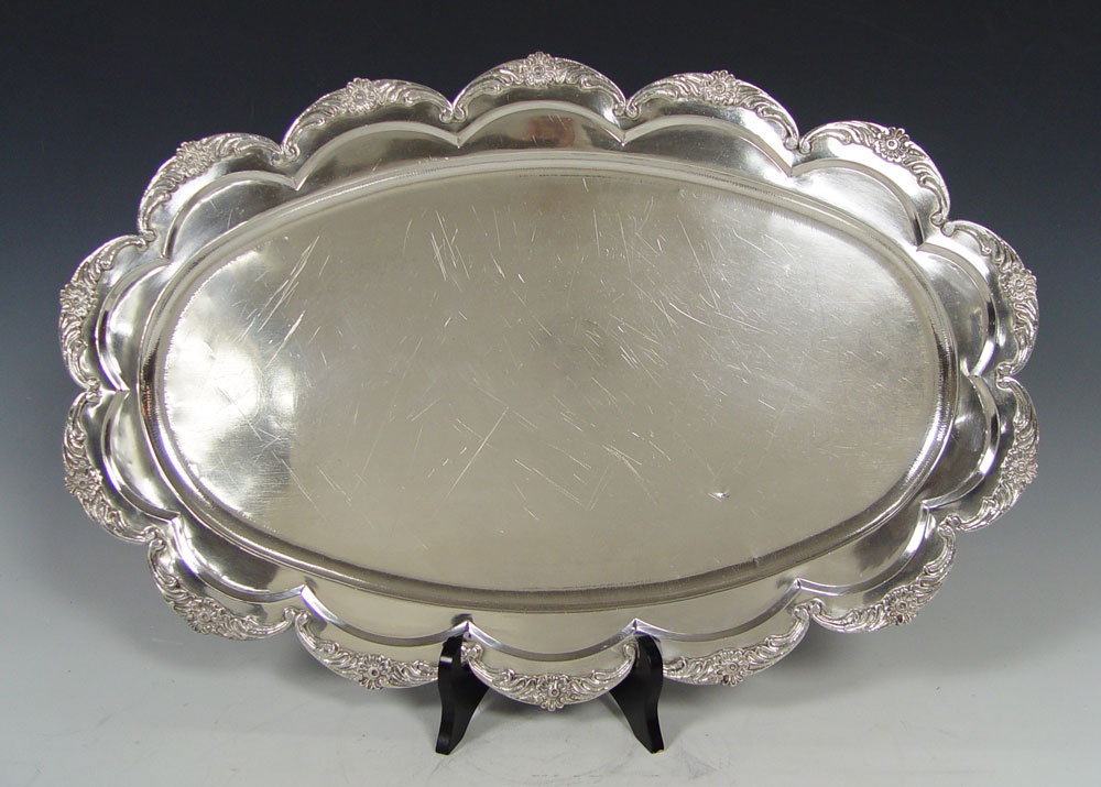 LARGE CAYCIA STERLING SILVER PLATTER: Embossed floral swag on scalloped rim. Marked Caycia 0925 with crossed hammers on base. Measures 25'' x 16 1/2''. Approx 52 troy oz.