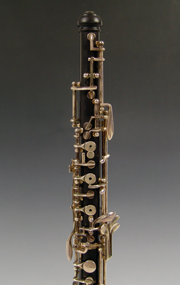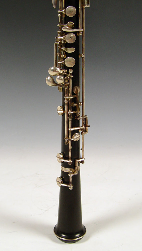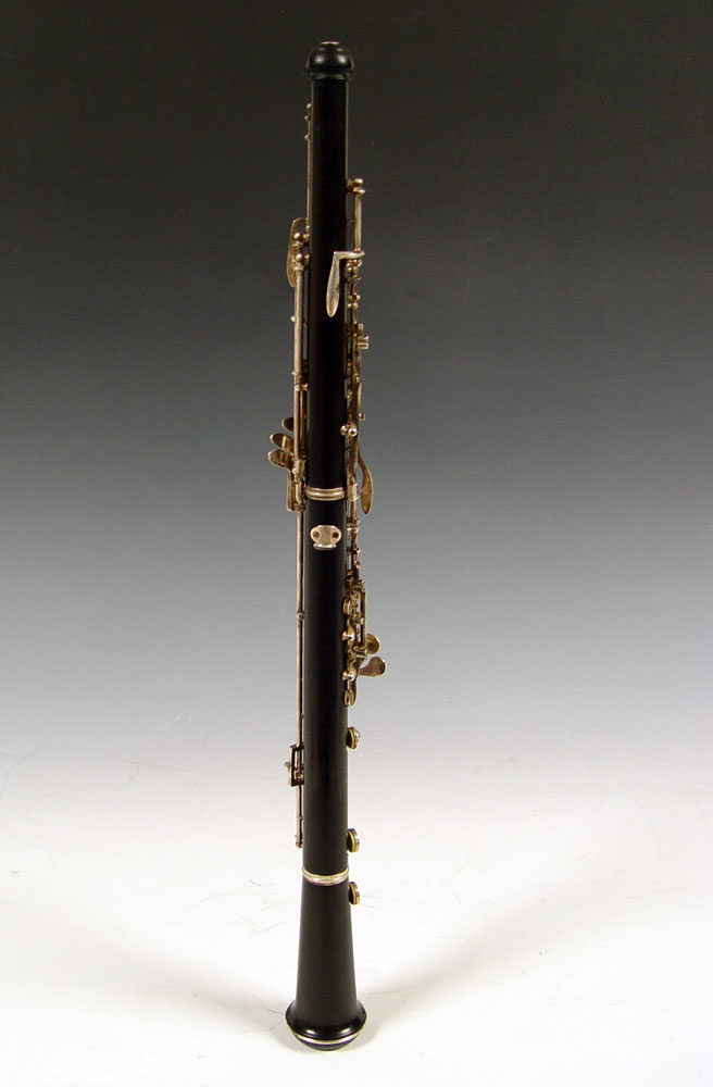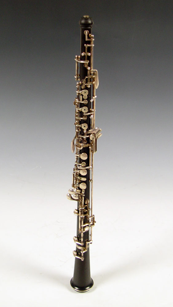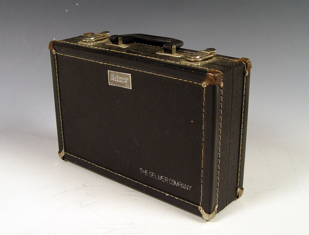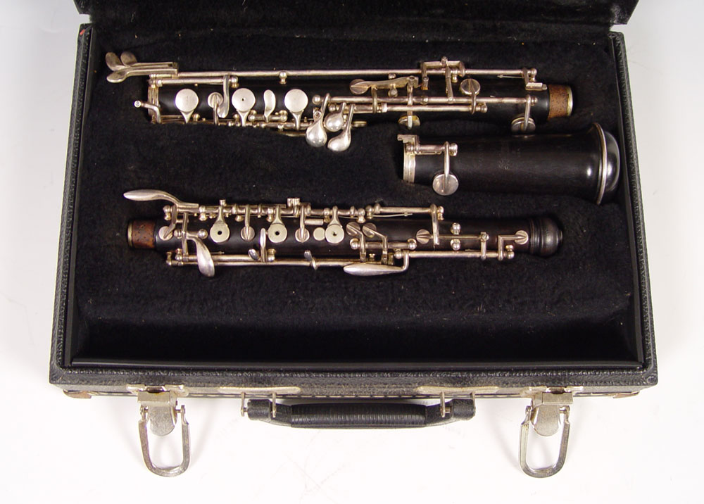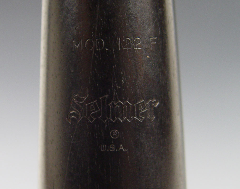 SELMER 122F WOOD OBOE WITH CASE: Grenadilla wood body with silverplated keys. Original cork present, no reed. Marked Mod. 112 F, Selmer USA. Comes in vinyl covered Selmer case. Case measures 9'' x 13 3/4'' x 4''.