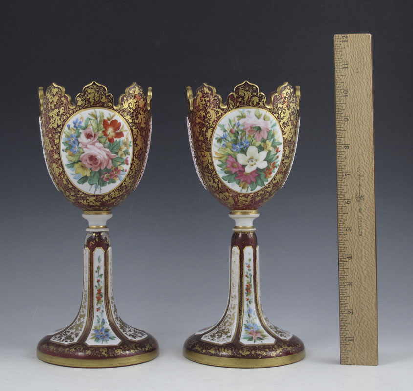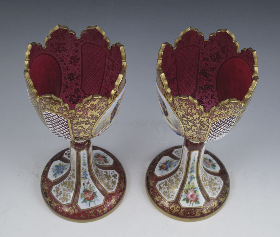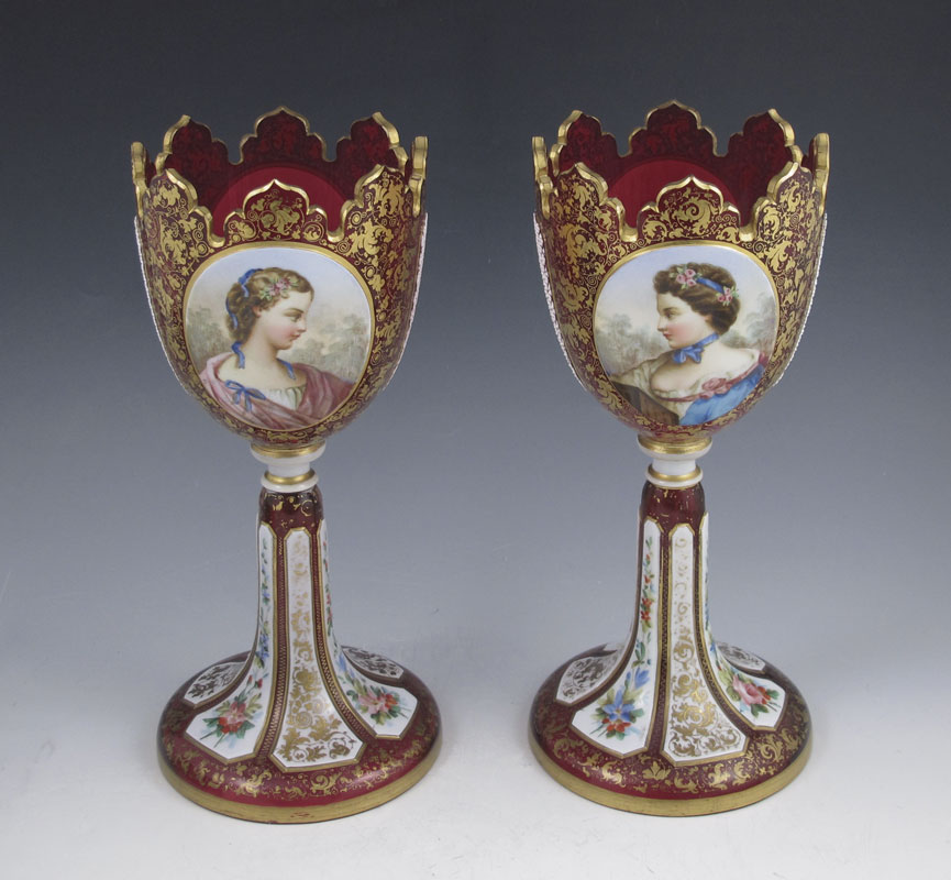 PAIR EARLY BOHEMIAN PORTRAIT GARNITURE: Cranberry glass with white overlay, each with a portrait plaque and floral painted plaque verso. Cross hatch cut panels on the side, the stems are also decorated in floral panels, all over gilt scroll work. 10.25''h. x 4 3/4'' base dia.