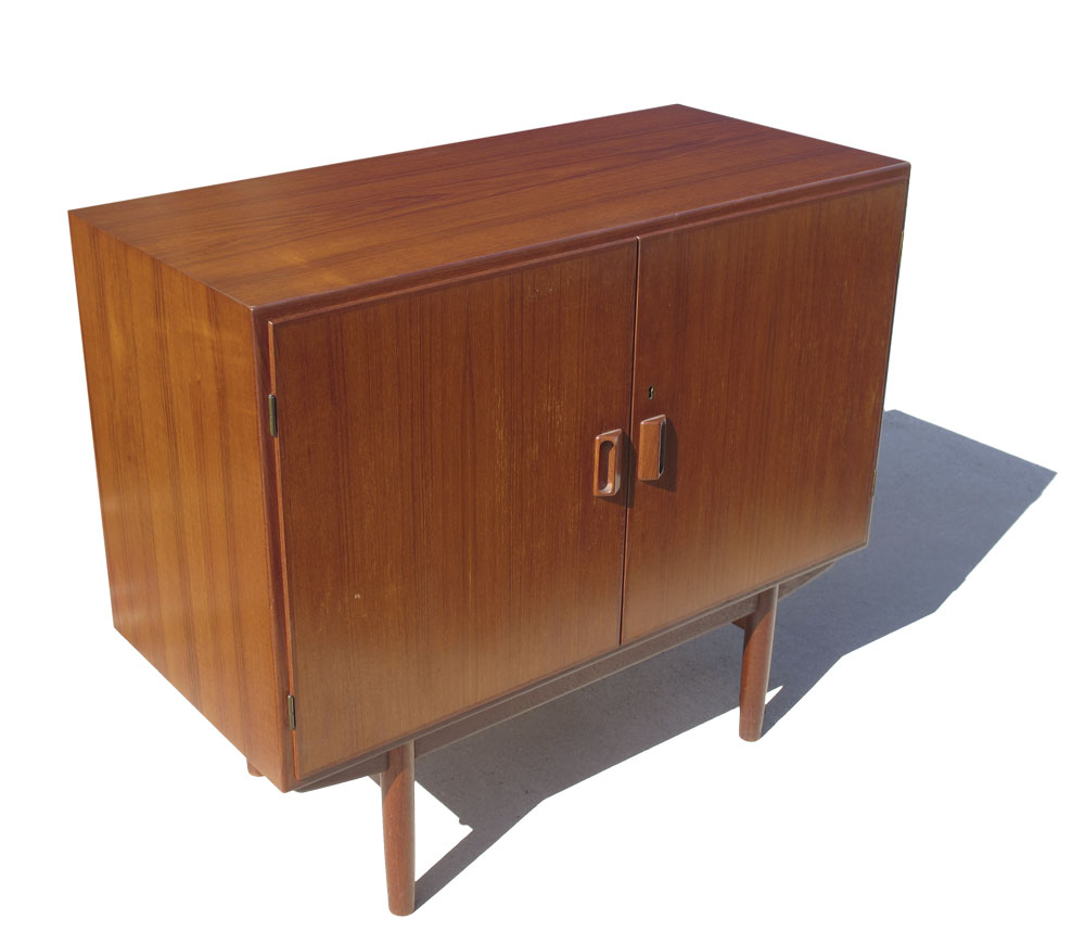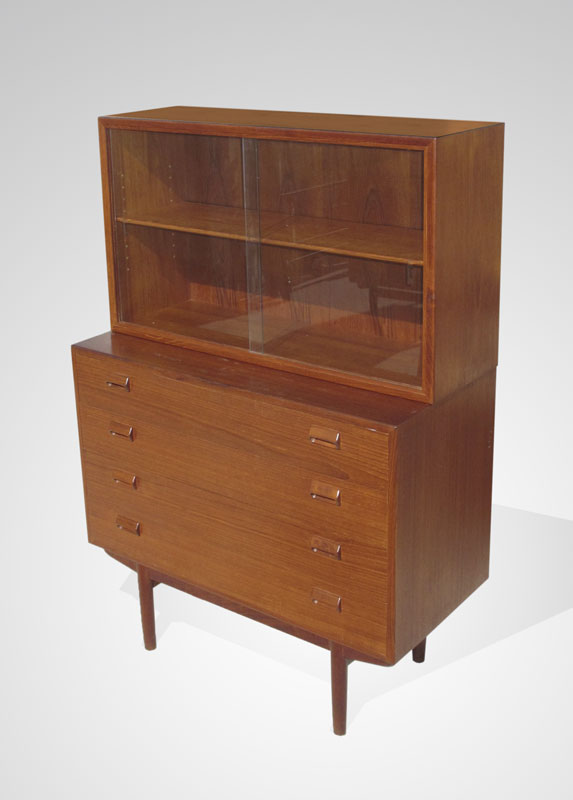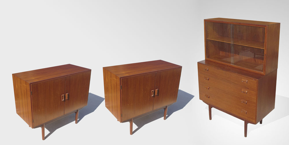 3 BORGE MORGENSEN / SOBORG MOBLER DANISH MODERN SIDE CABINETS: To include 4 door server with separate sliding glass door top with single interior shelf. Overall 57'' h. x 18 1/2'' x 39 1/4''. Pair of matching 2 door side cabinets, 34 1/4'' h. x 39 1/2'' x 18 3/8''.