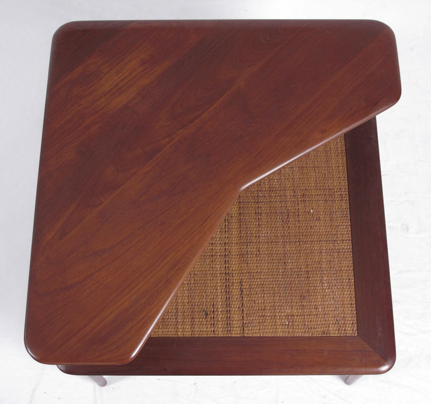 PETER HVIDT FRANCE DAVERKOSEN DANISH MODERN CORNER TABLE: Two level with woven grass surface, approx. 25''h. x 29.5 x 29''. fd button.