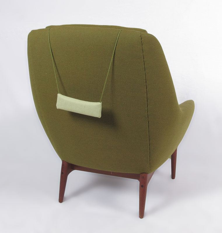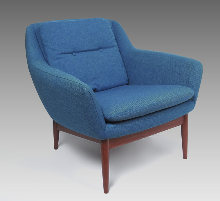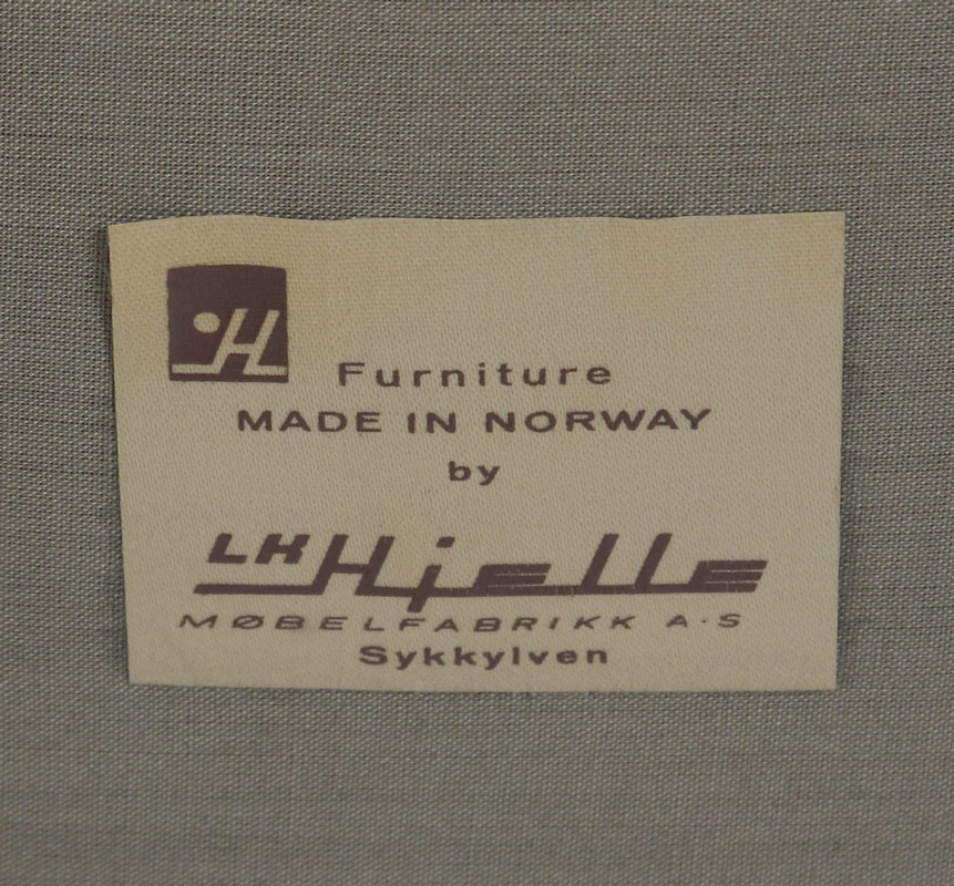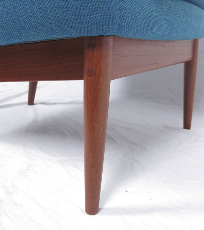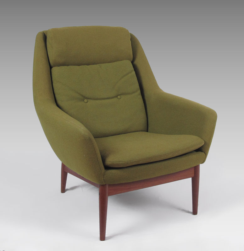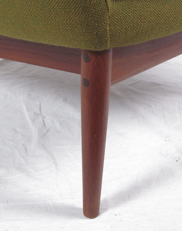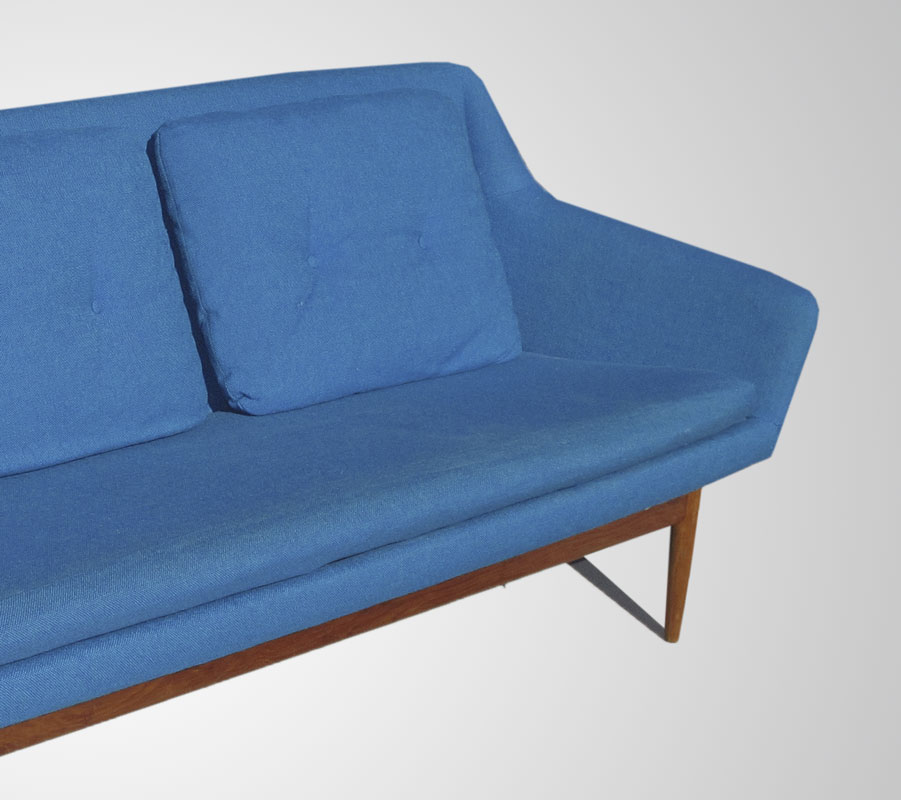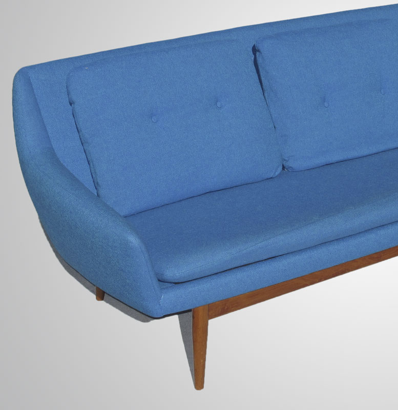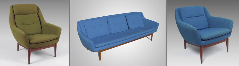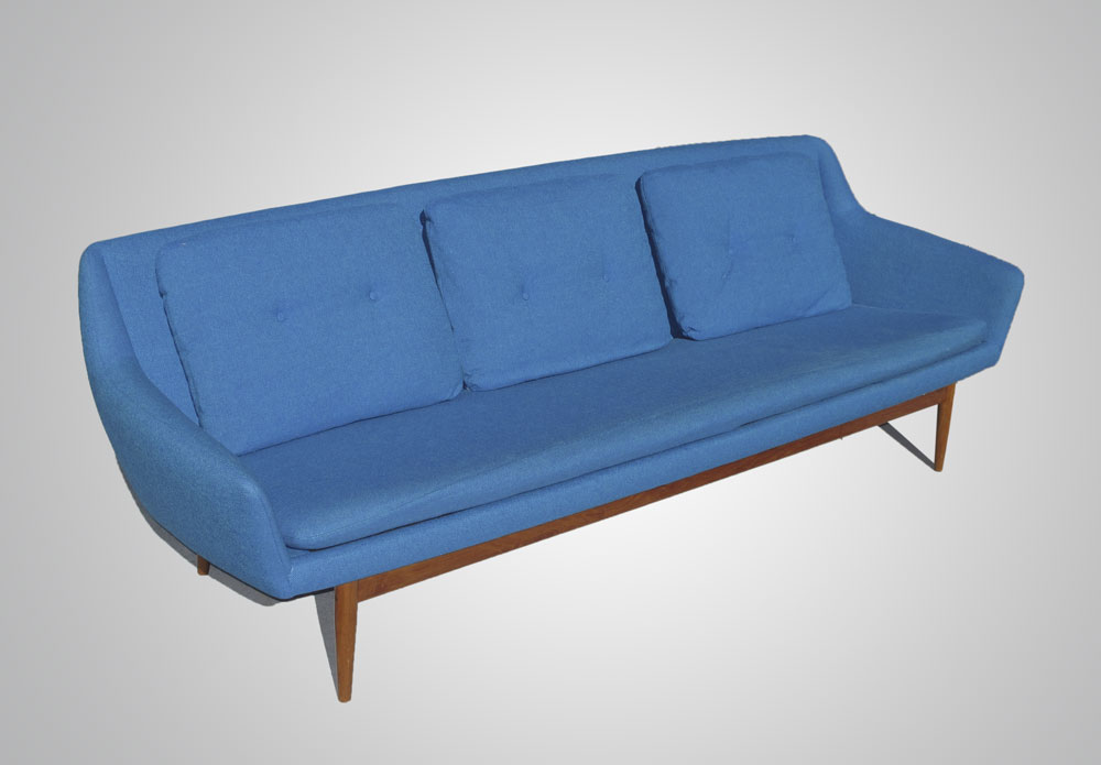 L.H. HEILLE MID CENTURY MODERN SOFA AND 2 CHAIRS: Made in Norway. Teak frame, original fabric. To include 1) Couch with blue fabric, 30 1/4'' h. x 94'' x 34''. 2) Arm chair with blue fabric 30 3/4'' h. x 30 1/2'' x 30 1/2''. 3) Larger arm chair with green fabric, 36 1/2'' h. x 31 1/4'' x 35''.