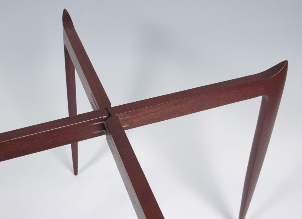 FRITZ HANSEN DANISH MODERN FOLD AWAY TRAY TABLE: Round tray top rests on a folding stand. Tray 23.5'' dia., 16'' tall. Marked FH, Made in Denmark.