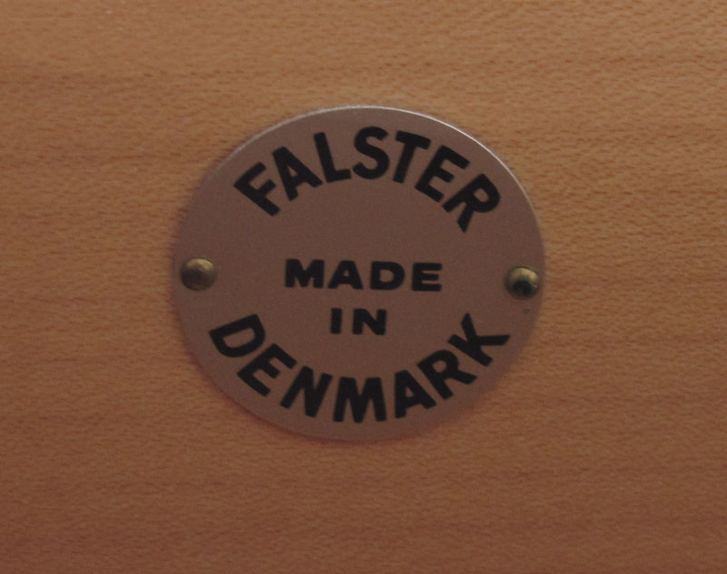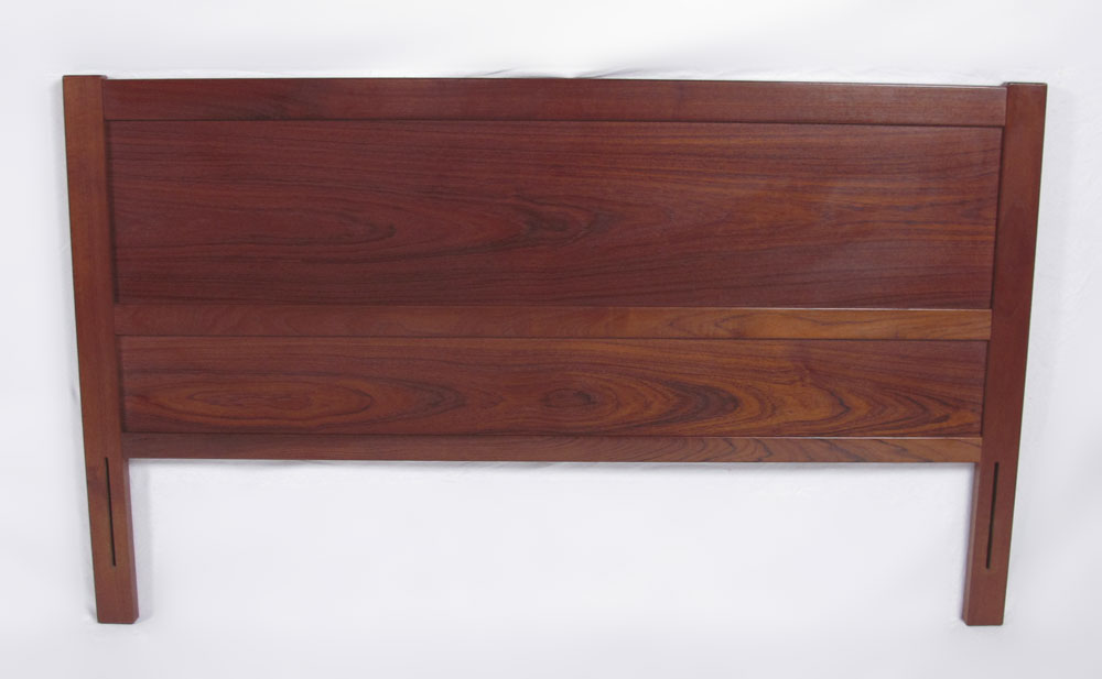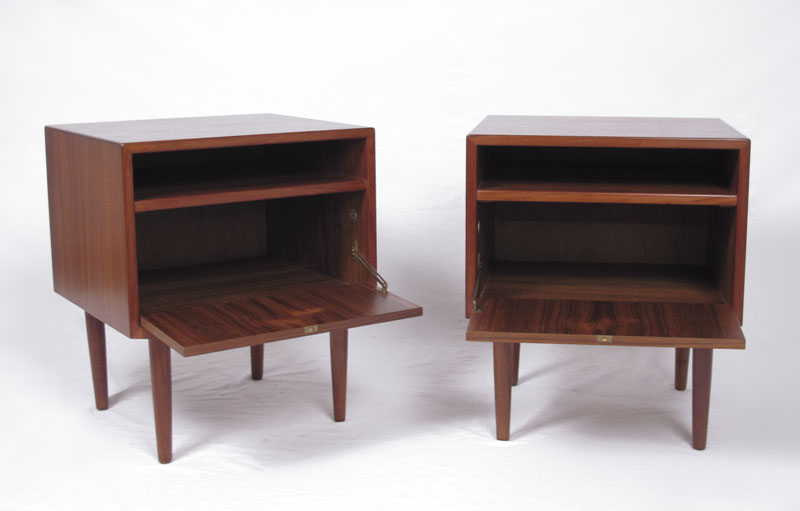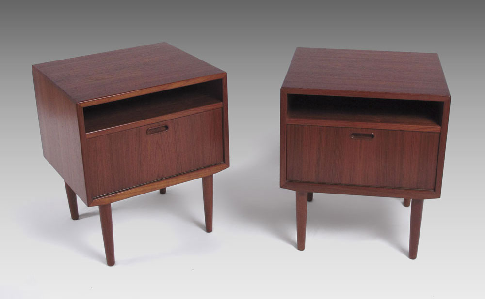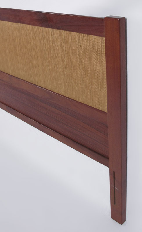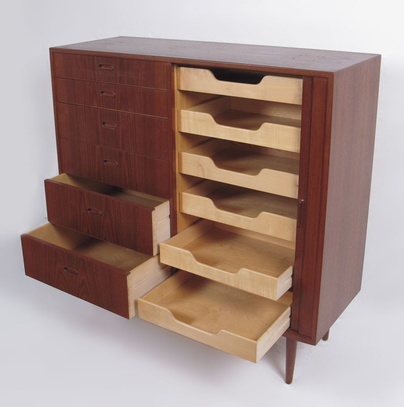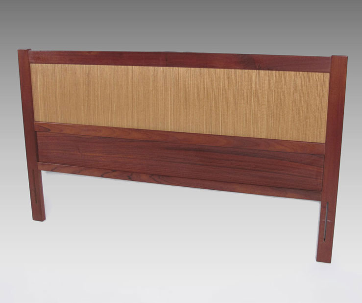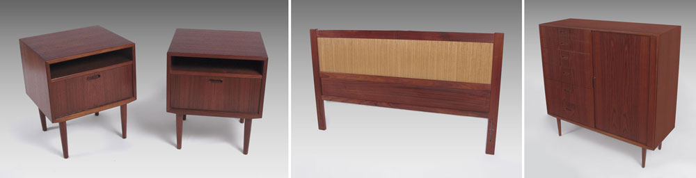 IB KOFOD LARSEN / FALSTER DANISH MODERN BEDROOM SET: To include a TAMBOUR CABINET, 6 drawers next to tambour door. 6 more slide out trays in the tambour side, 47'' h. x 48'' x 17 3/4''. Pair NIGHTSTANDS 23 1/4'' x 17 1/2'' x 19 3/4'', and a HEADBOARD 38 1/4'' x 61 1/2'' x 3'', reversible teak or grass.
