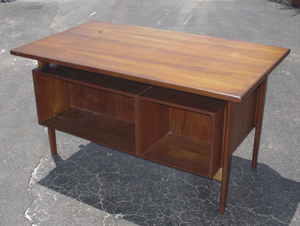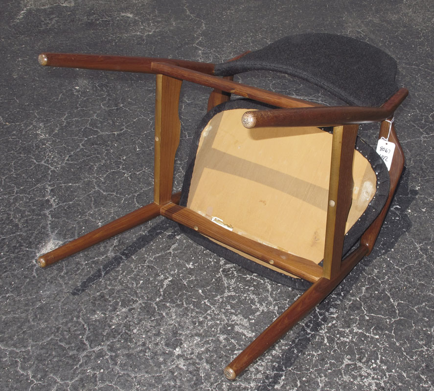 KAI KRISTENSEN DANISH MODERN DESK AND ARNE VODDER CHAIR: 3 drawer desk with 2 cubby holes opposite side. Unmarked as to maker. 31 1/2'' h. x 53'' x 30 3/4''. Sold with Arnie Vodder arm chair, unmarked. 31 1/2'' h. 24'' x 22''.