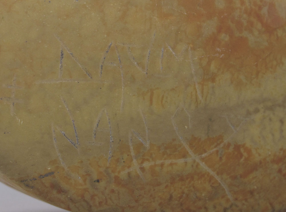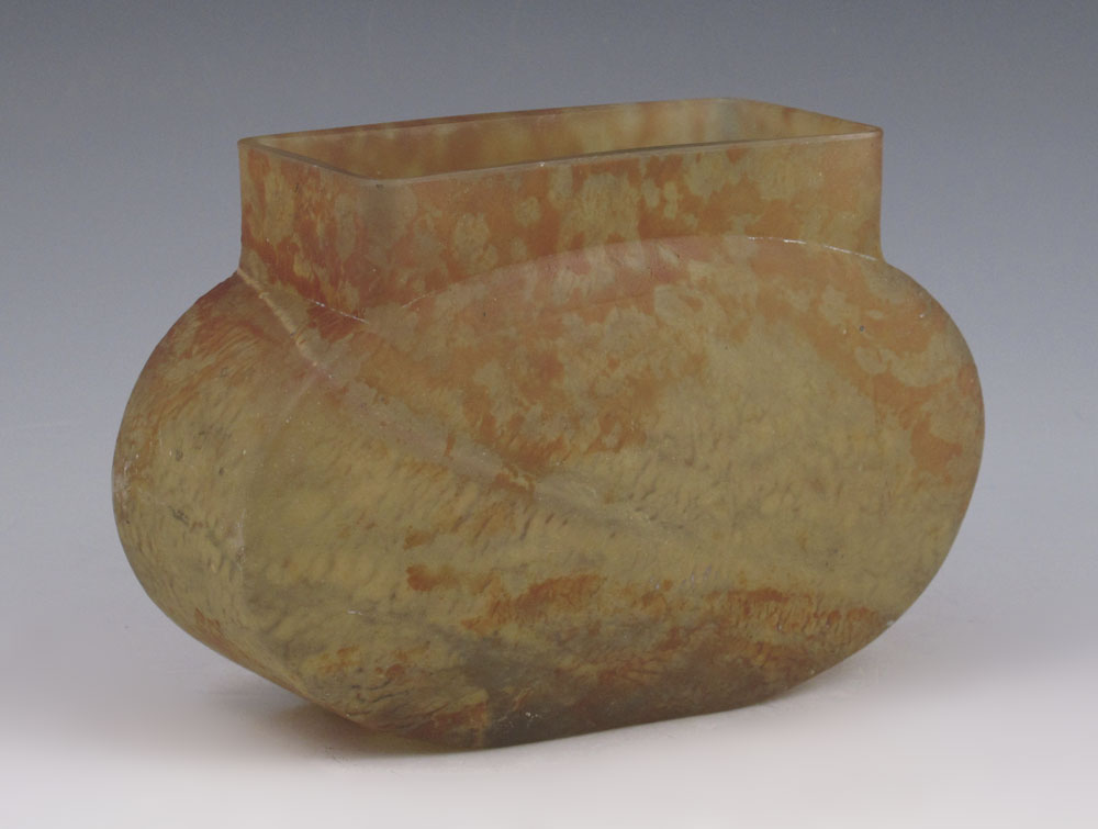 DAUM NANCY ART GLASS VASE: Mottled yellow and amber color pillow vase, signed, 4 1/2''h. x 7'''' x 2.5''.