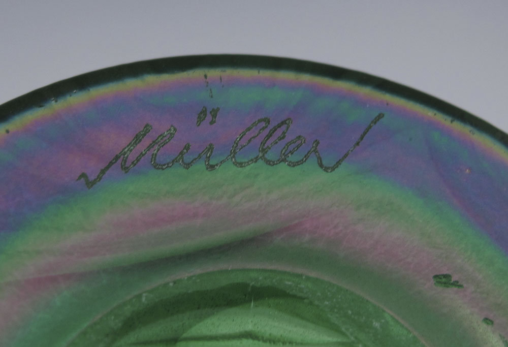 MULLER IRIDESCENT ART GLASS VASE: Iridescent blue and green pulled feather design. Signed. 13'' tall.
