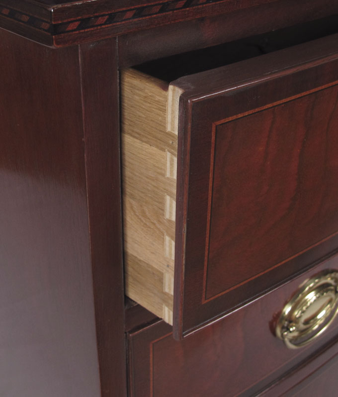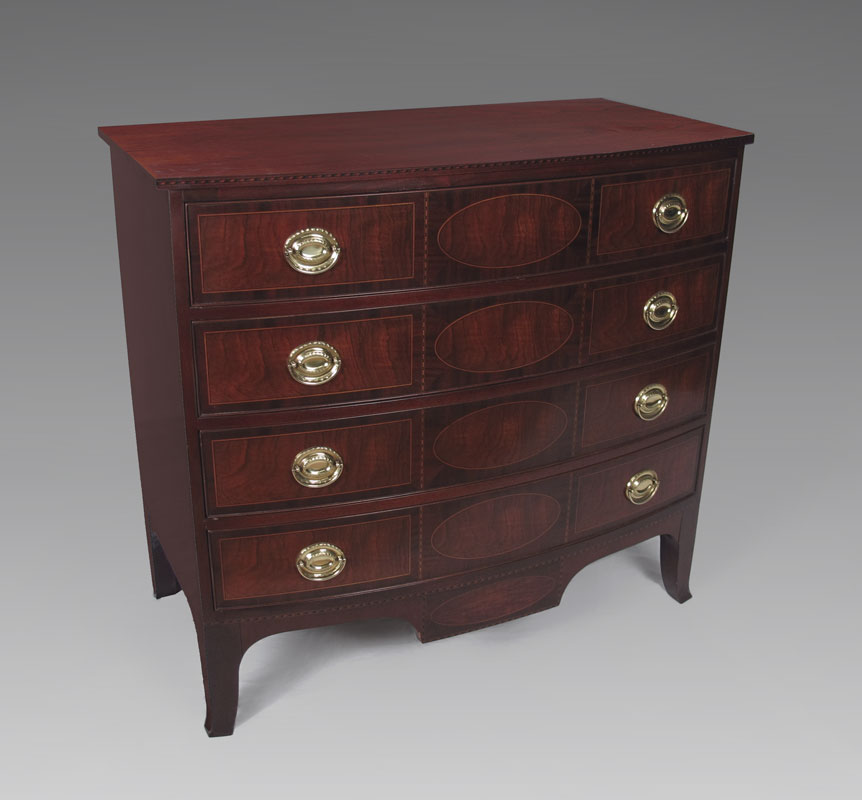 BAKER FURNITURE HISTORIC CHARLESTON CHEST OF DRAWERS: Baker Furniture and Historical Charleston Reproductions metal tags. Four drawer, inlay in richly grained mahogany, 37 3/4'' h. x 41'' x 22''.