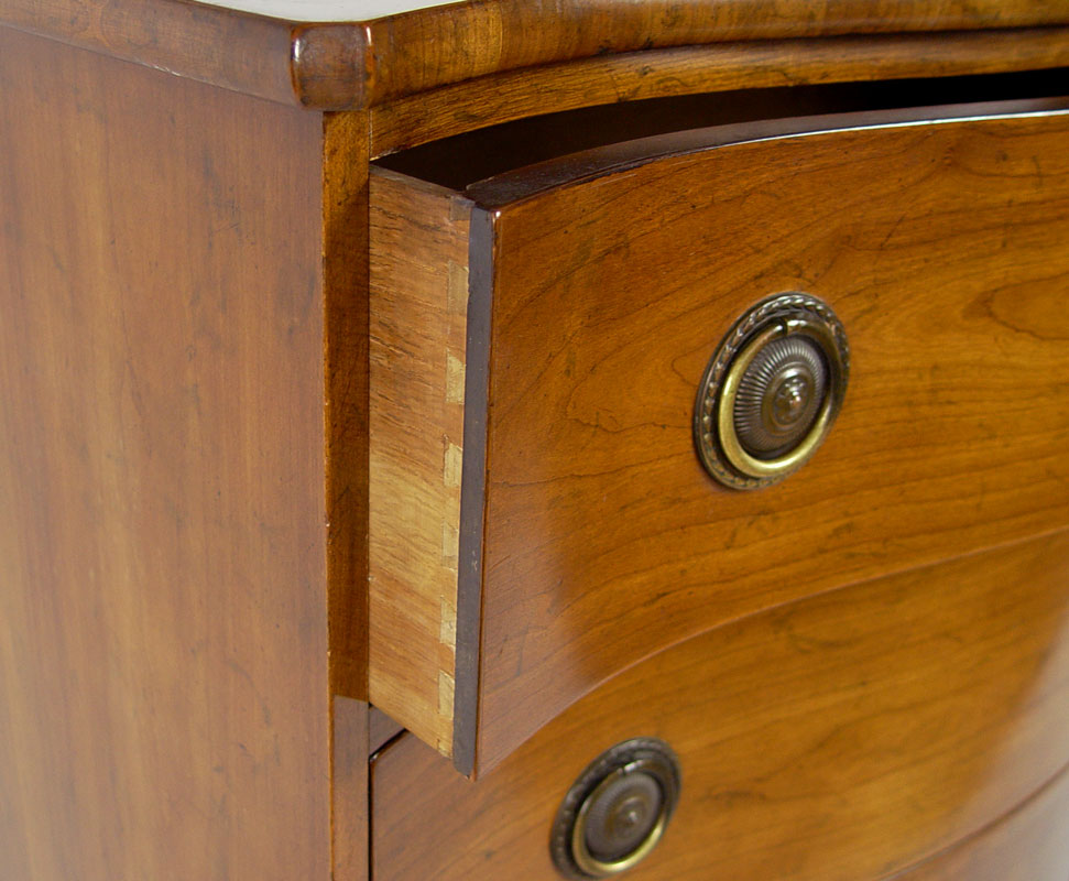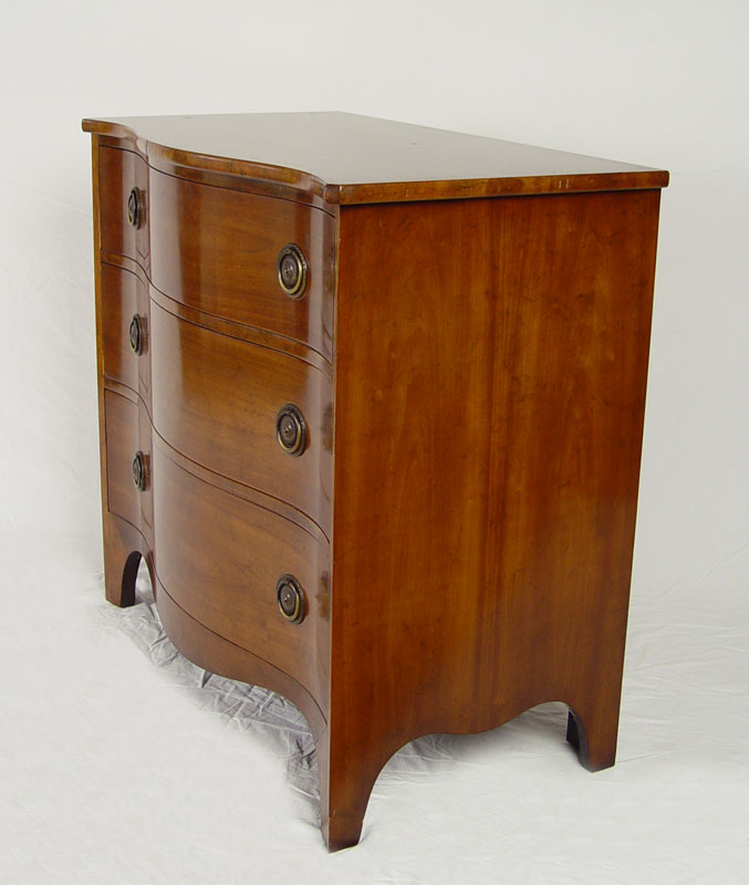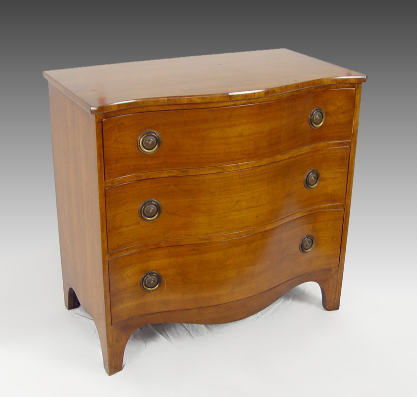 BAKER FURNITURE HEPPLEWHITE STYLE MAHOGANY CHEST: Three drawer serpentine front chest on high French feet, round brass pulls. Fitted with a glass top. Baker metal label. 34 1/2'' tall x 36'' wide x 20 1/2'' deep.