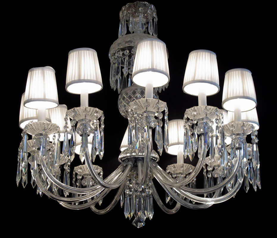 12 LIGHT CRYSTAL CHANDELIER: Each with a shade. Bent arms, faceted prisms. Measures approx. 31''h. x 29 1/2'' dia.