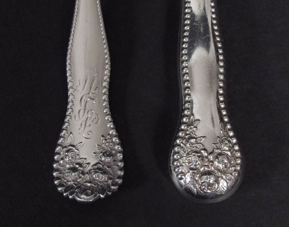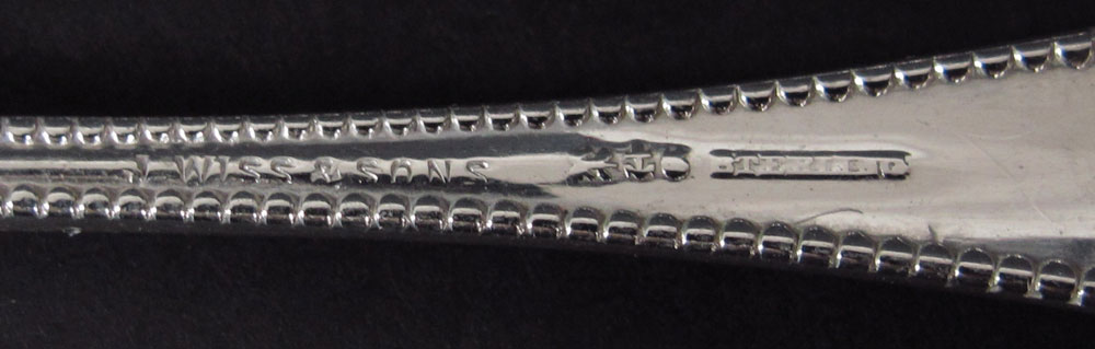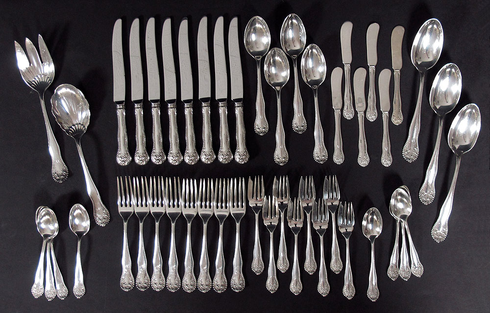 GORHAM LANCASTER STERLING FLATWARE: Assembled collection approx. 47 pieces in the Lancaster pattern by Gorham, retailed by J. Wiss & Sons to include 8 forks (7''), 8 salad (6''), 8 teaspoons (5 3/4''), 8 hollow knives (8 3/4''), 6 solid butter knives (5 3/4''), 4 tablespoons (7''), 3 serving spoons (8 1/2''), salad set (fork 8 5/8'', spoon 8 5/8''). Set has 2 different monograms. Sold with silver chest 3 1/4'' x 12'' x 16''. Approx. 43.6 troy oz.