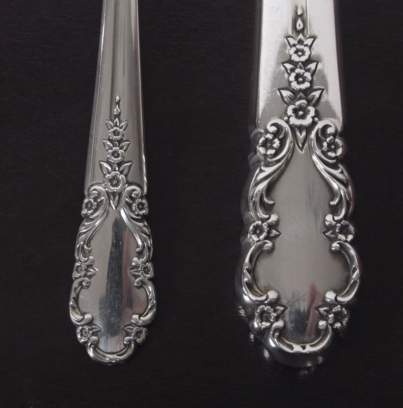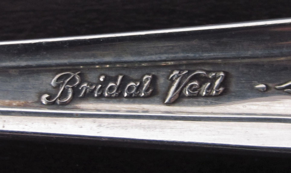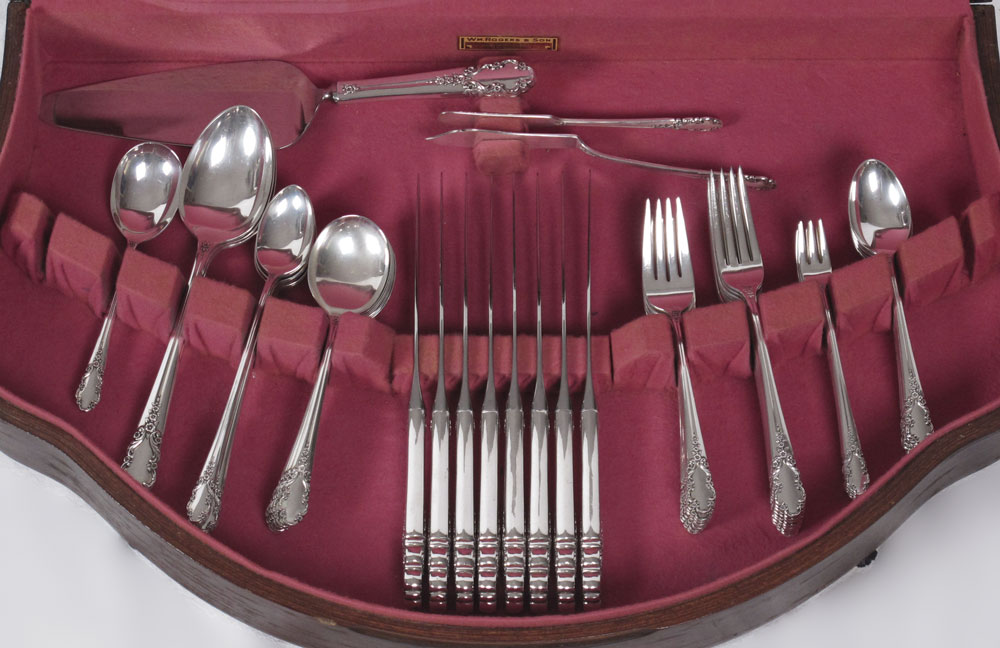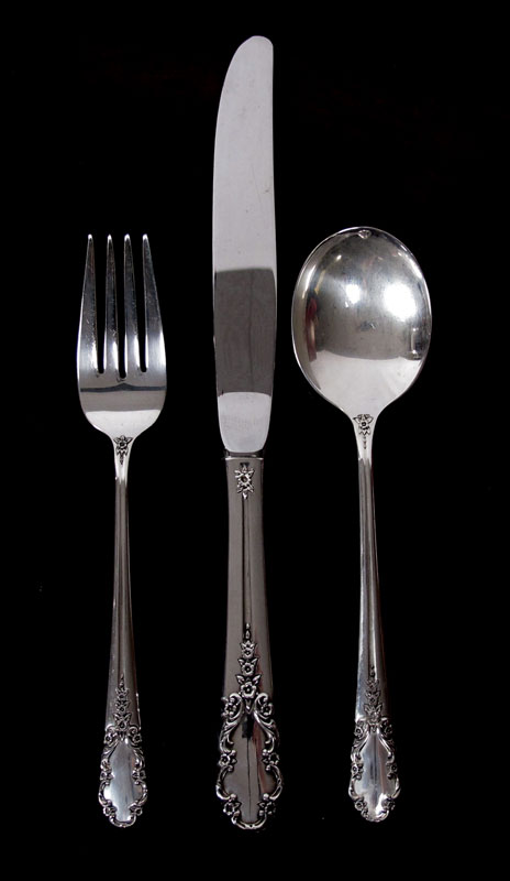 ROGERS STERLING BRIDAL VEIL FLATWARE SET: Complete service for 8, approx. 63 pieces in the Bridal Veil pattern by Rogers Sterling to include 8 forks (7 1/4''), 8 salad forks (6 1/2''), 8 cocktail forks (5 1/2''), 8 teaspoons (6''), 8 soup spoons (6 1/2''), 8 iced tea spoons (7 1/2''), 8 hollow handle knives (9 1/8'') 3 table spoons (8 1/2''), sugar scoop (5 7/8''), master butter (7 1/8''), butter knife (5 3/4''), hollow handle cake server (10 1/4). Sold with shaped silver chest, 3 1/2'' x 22 1/2'' x 14. Approx 64.7 troy oz.