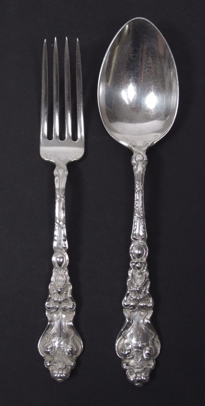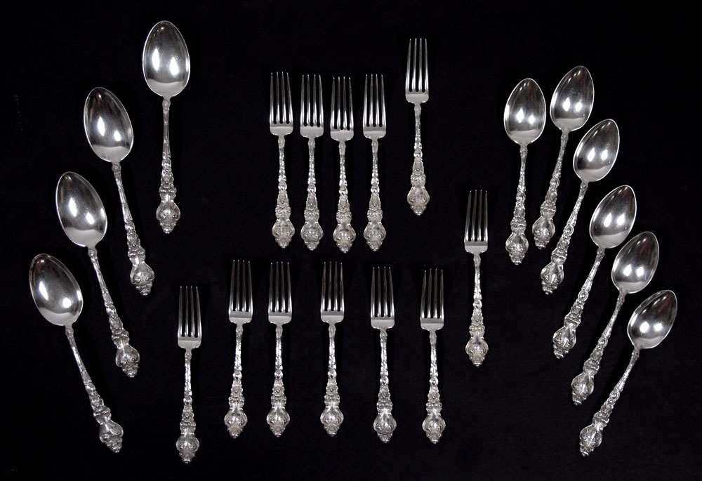 UNGER BROTHERS DOUVAINE STERLING FLATWARE: Approx. 22 pieces in the Douvaine pattern by Unger Brothers to include 12 forks (6 7/8''), 6 soup spoons (7 1/4''), 4 tablespoons (8 1/8''). All spoons monogrammed H or L, no monogram on forks . Approx. 37.6 troy oz.
