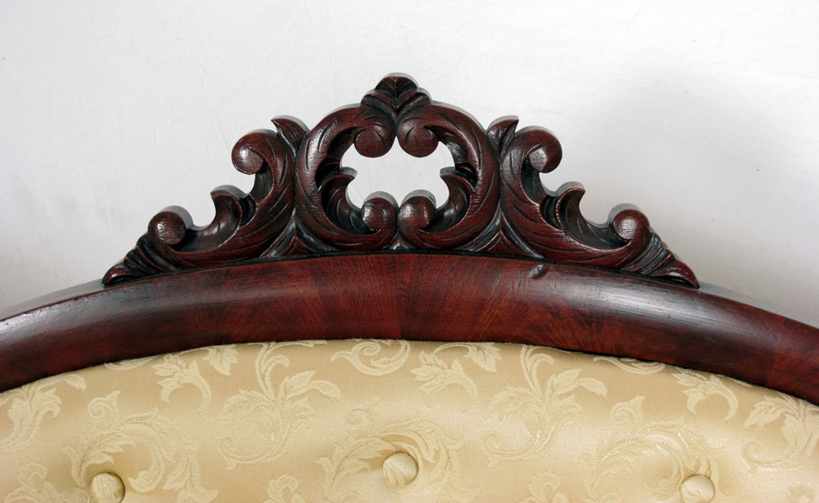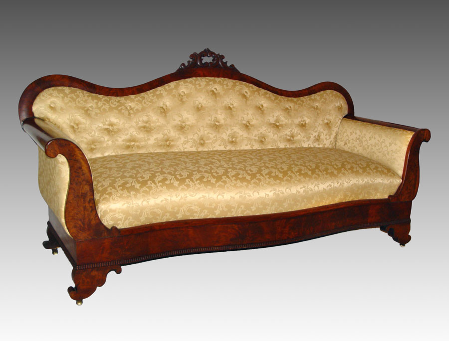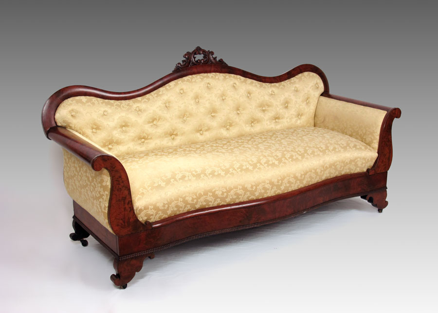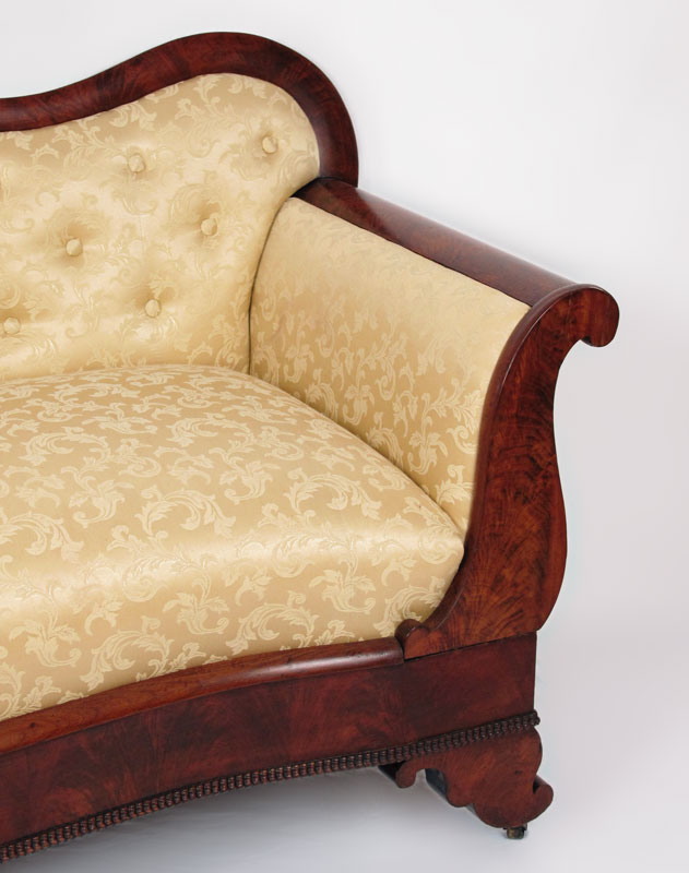 AMERICAN EMPIRE PERIOD SOFA: Carved decoration on top rail, gold foliate scroll upholstery. 37'' h. x 72'' x 26 1/2''.