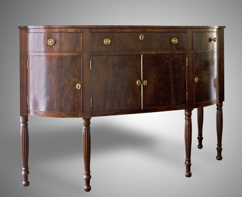EARLY 1840'S FLAME GRAIN MAHOGANY SIDEBOARD: 3 drawer over 4 door on 6 carved and turned legs, brass hardware. Key in office. 41 1/2'' x 60 1/4'' x 22 1/4''