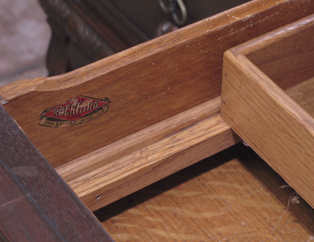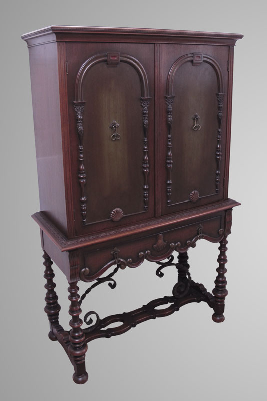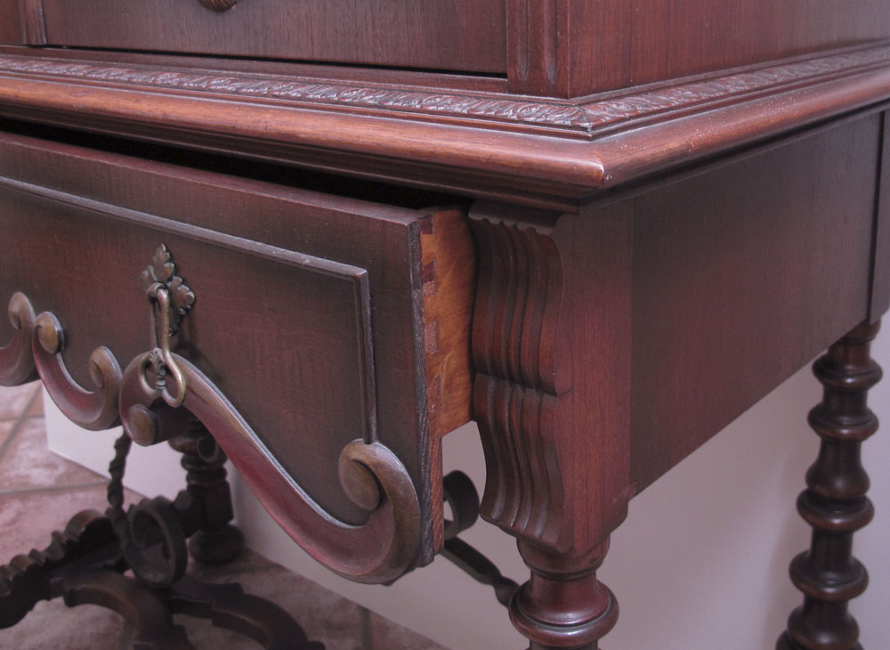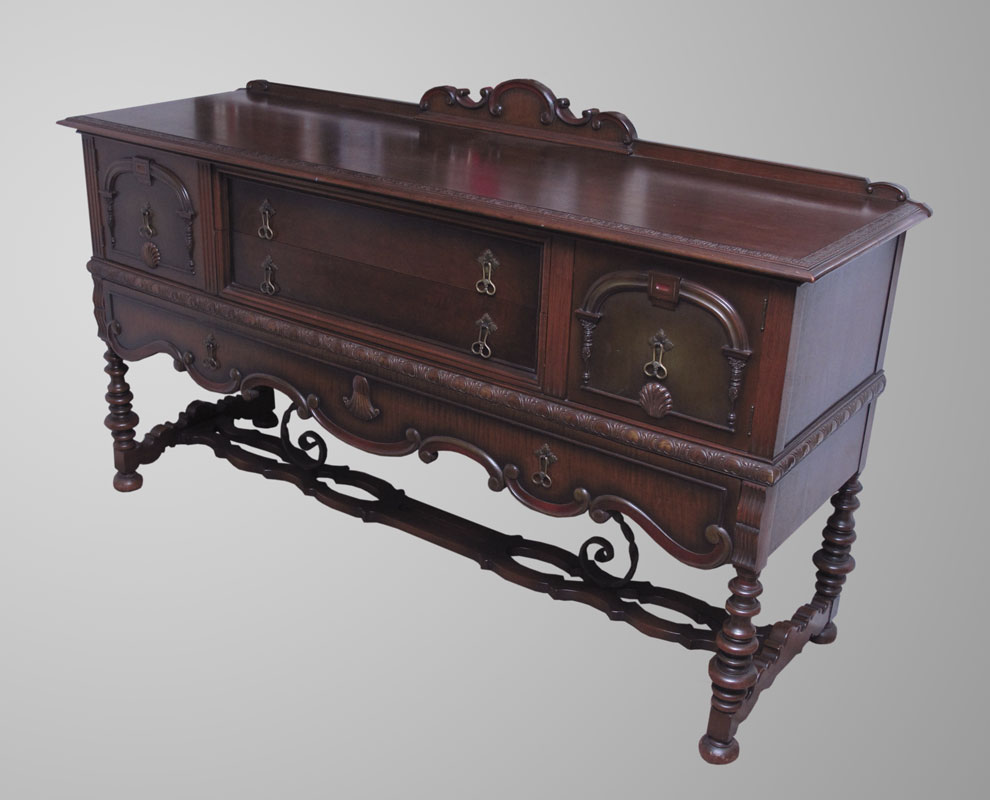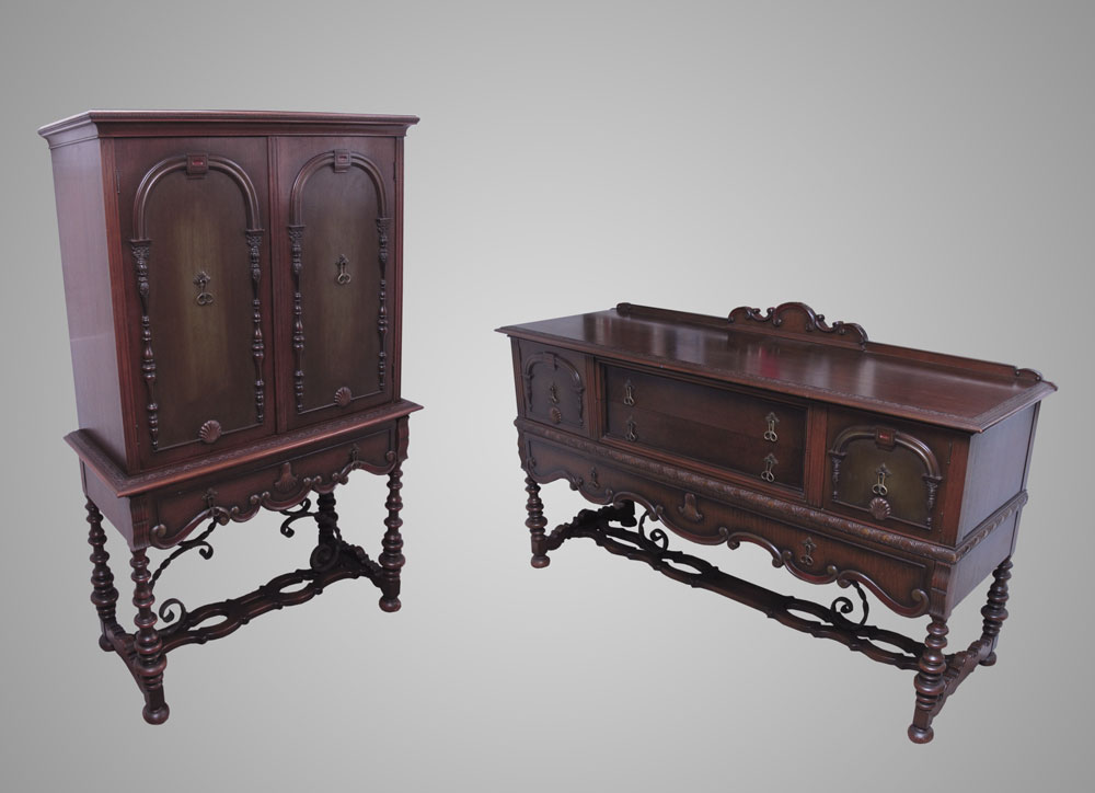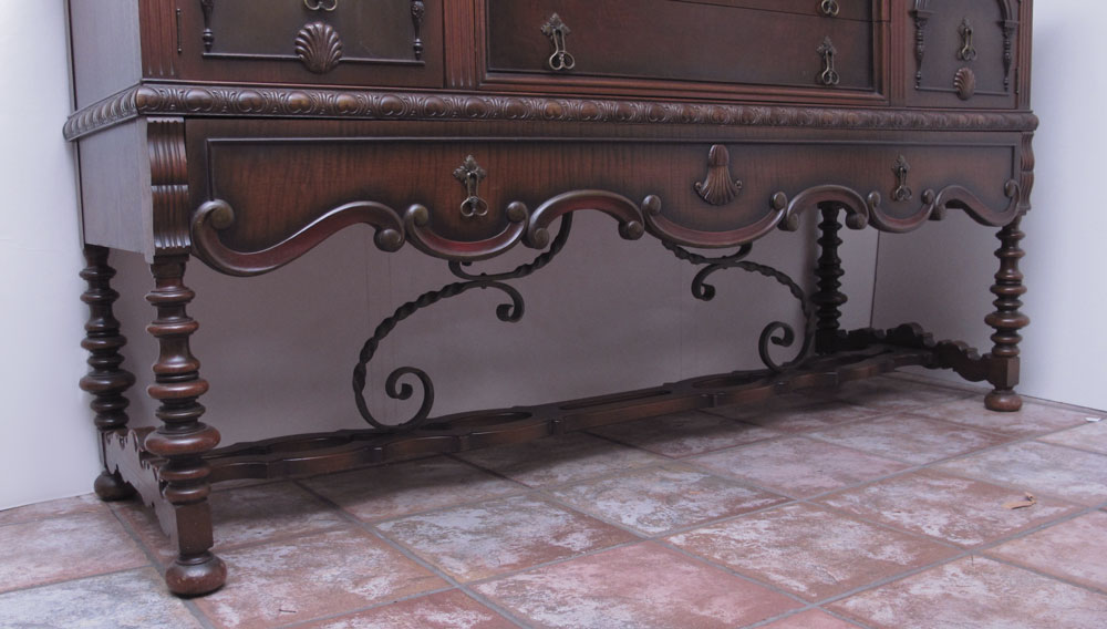 2 PIECE SPANISH COLONIAL STYLE CHINA CABINET AND SIDEBOARD: Black iron stretchers. Empire Furniture, Rockford Ill. To include 1) China cabinet 2 doors over full length drawer, 64 1/4'' h. x 40 1/4'' x 17 1/2''. 2) Sideboard 2 half length drawers center with door on either side over full length drawer. 43'' h. x 72'' x 23.