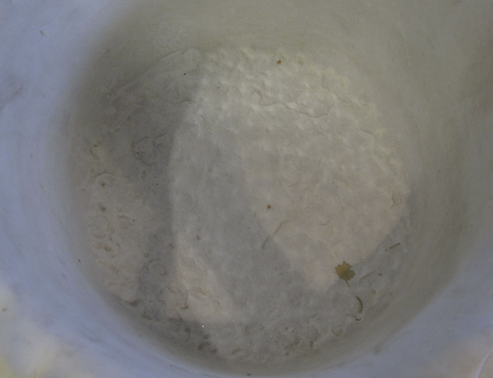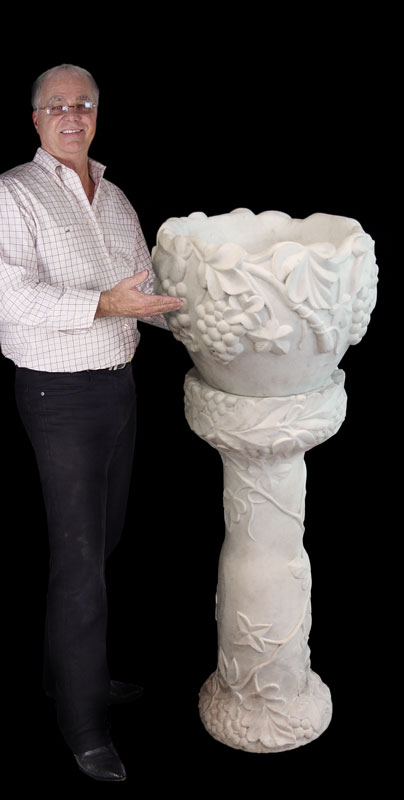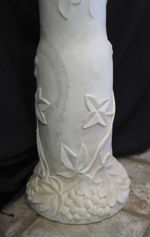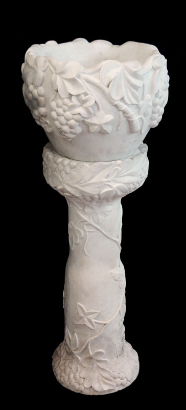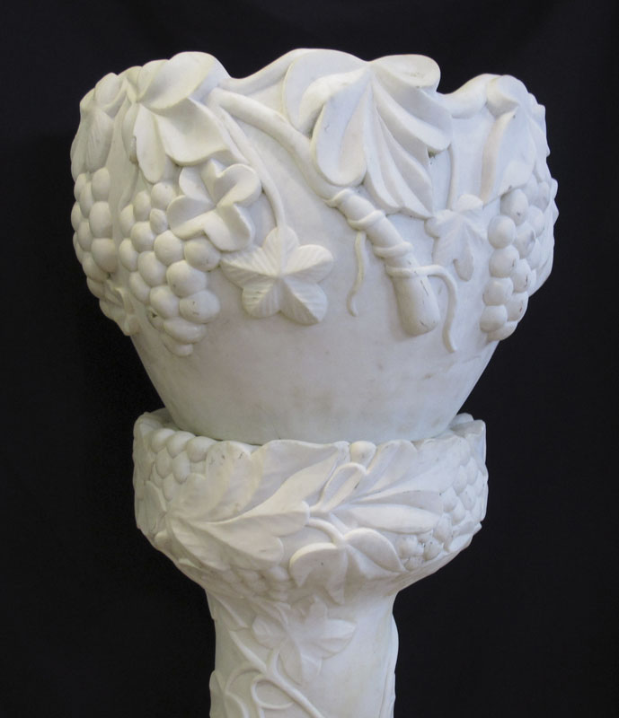 CARVED WHITE MARBLE JARDINIERE AND PEDESTAL: Carved with grape vine and grapes motif. Pedestal 37 1/2'' h. x 14'' base dia., jardeniere 14'' h. x 19'' dia., 4 ft.3 inches tall overall.