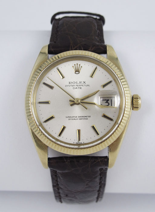14K GOLD ROLEX OYSTER PERPETUAL DATE MODEL: Ref #1503. Serial # 6 mil, ca 1979. Gents gold watch on a leather strap. All original, new crystal, new gaskets, and movement has been serviced. Note condition of dial, some phosphorescent dots have disappeared, otherwise in good condition and currently keeping time.