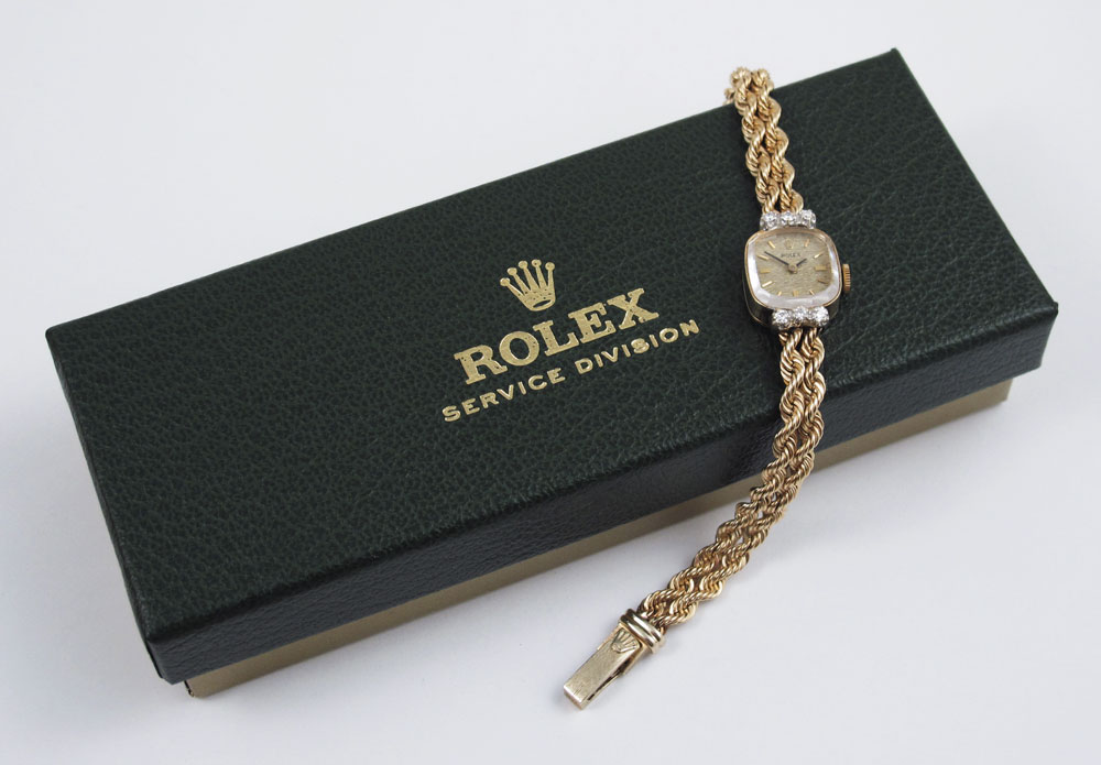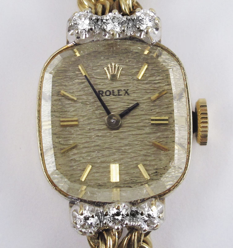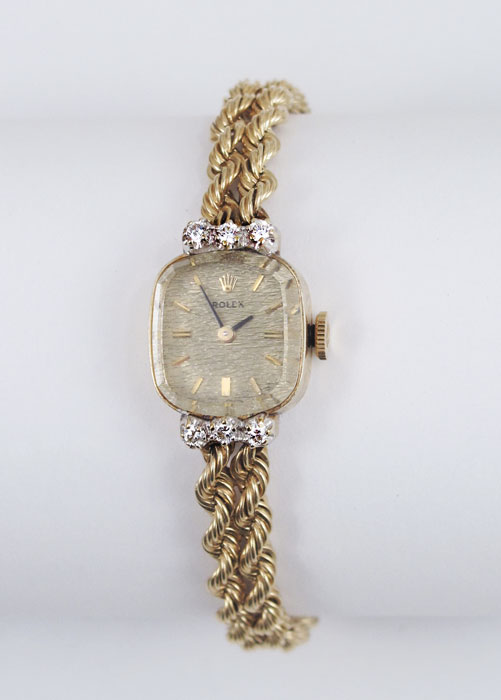 ROLEX LADIES 14K GOLD AND DIAMOND WATCH: Rolex 14K yellow gold watch and 14K rope bracelet style band with the Rolex crown on the clasp. Beveled crystal, textured dial. The case is flanked by 6 diamonds. In running order. Sold in the Rolex service box. Approx. 6 3/4''l. Gross weight approx. 27.8 grams.