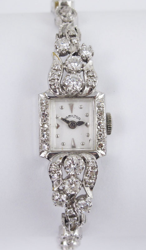 LADIES HAMILTON DIAMOND LUXURY WATCH: 14K white gold watch in running order. This watch is swimming in diamonds, contains forty two round brilliant cut and single cut diamonds. Weight: 1.50 CT. Approx. The diamonds average VS in clarity and G-H in color. Mechanical movement. The watch is running. Very good condition. Weight: 21.7 grams. Extra long ladder clap.