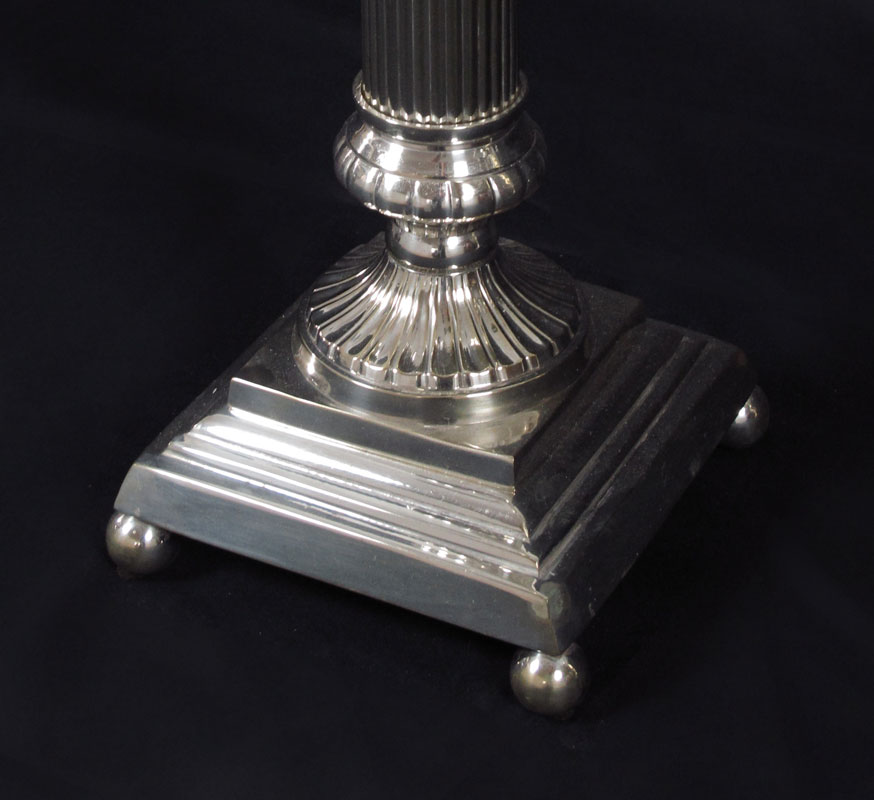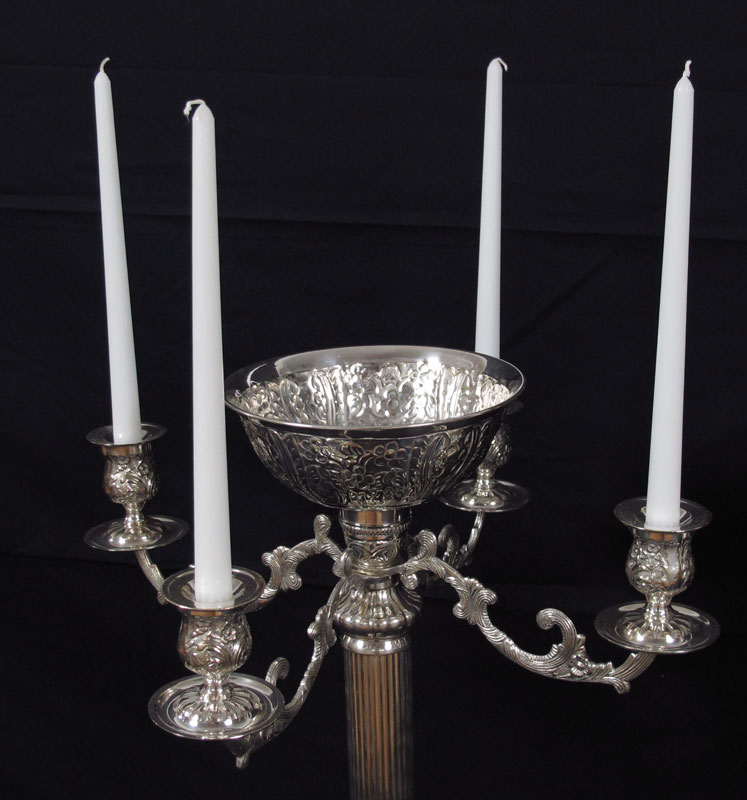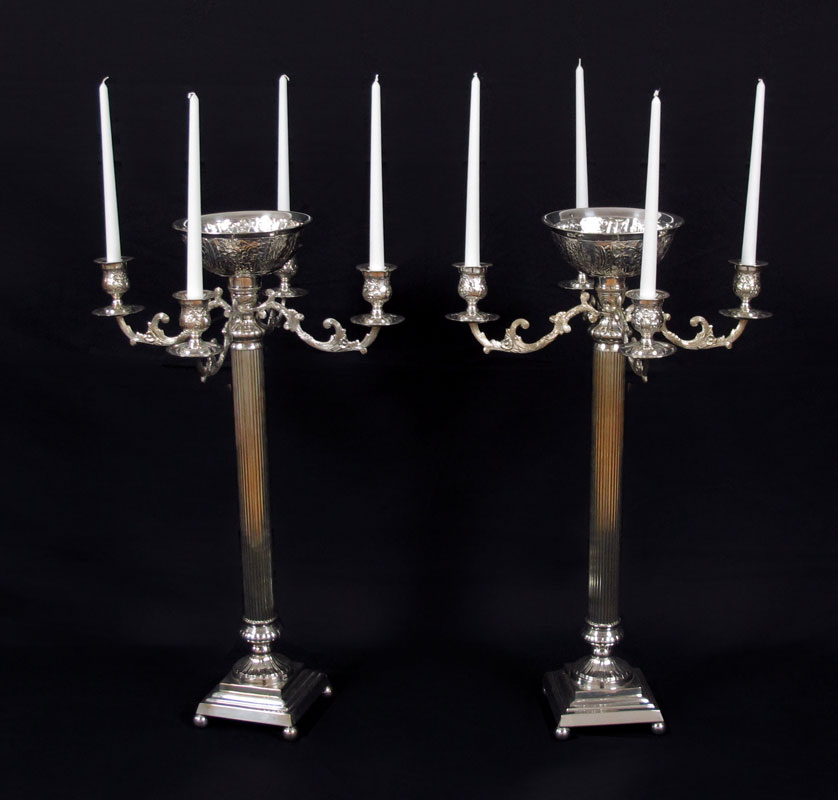 PAIR OF PALATIAL SILVERPLATE CANDELABRA: 4 light candelabra with centerbowl, unmarked as to maker. 32'' h. x 20'' dia.