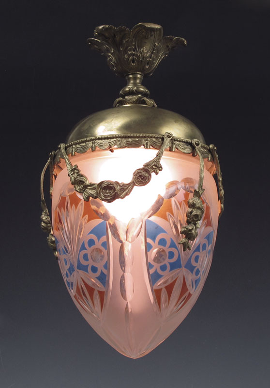 ART DECO CHANDELIER: Gilt metal fixture with floral garland decoration. Cut glass shade, with burnt orange and blue highlights. Overall 16 1/2'' h. x 9'' dia.
