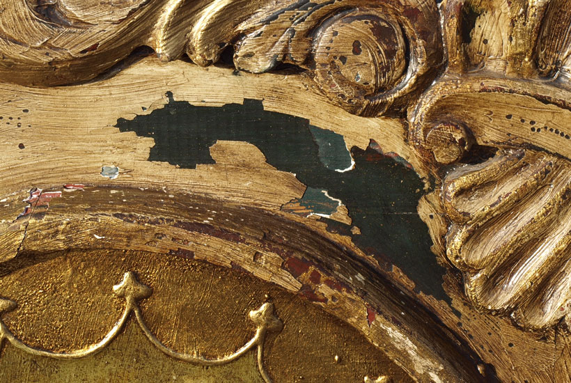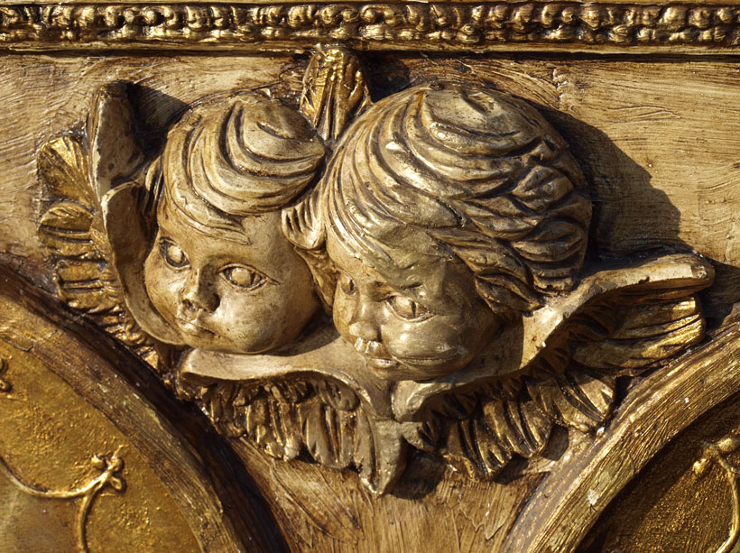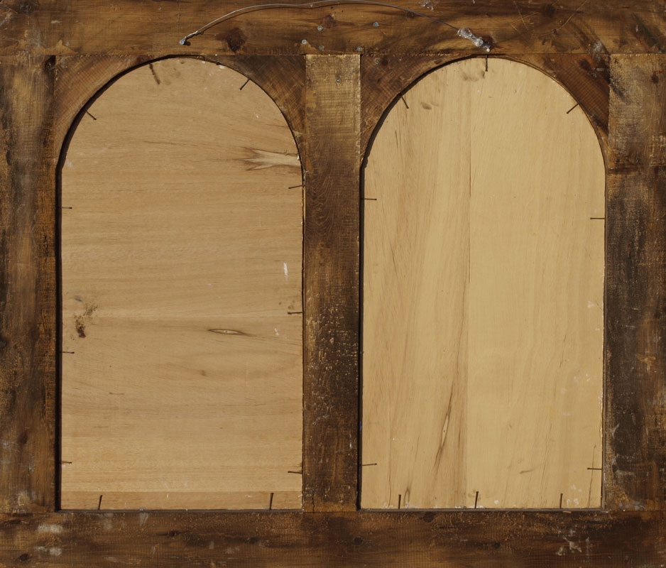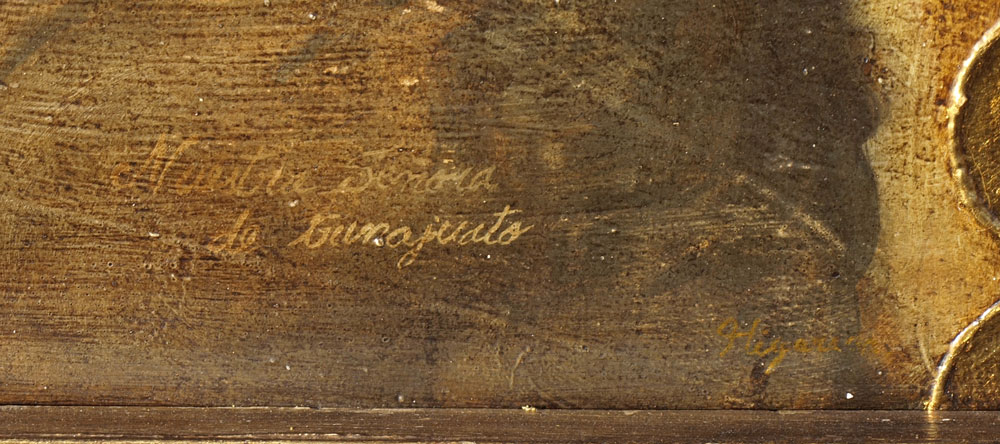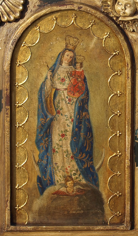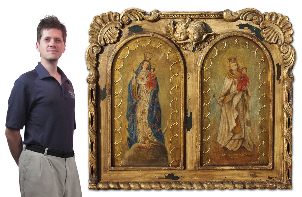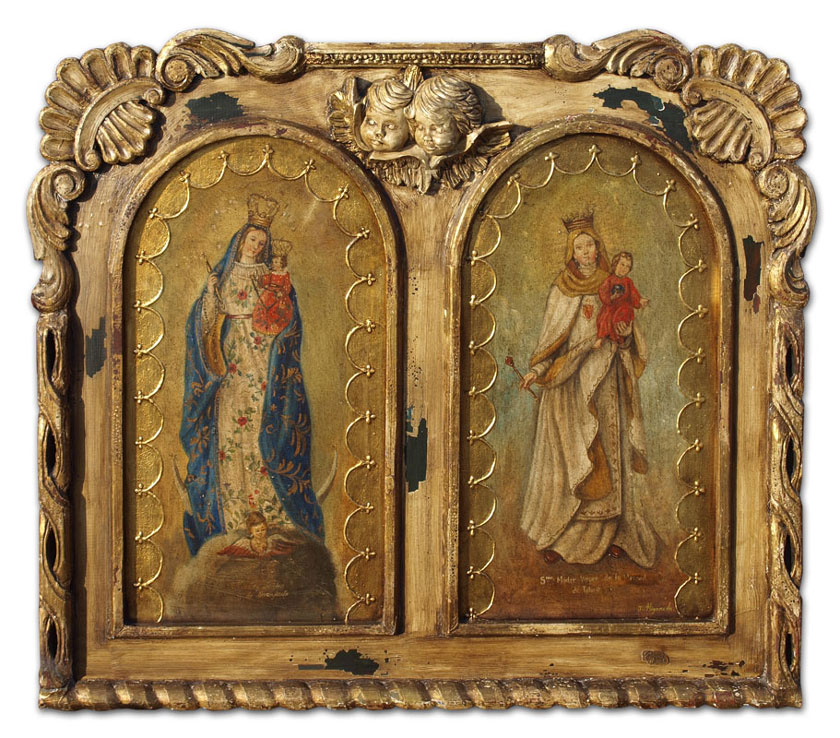 LARGE DECORATIVE LATIN AMERICAN DIPTYCH OF TWO VIRGINS: encased in fantastic custom carved, hand painted and antiqued frame, 48'' x 56'' panel 1) Madre Virgin De La Merced De Toluca, signed J Higareda 34 «'' x 19'' panel 2) Maestra Senora De Guanajuato; the frame has an applied decoration in relief of two angel heads.