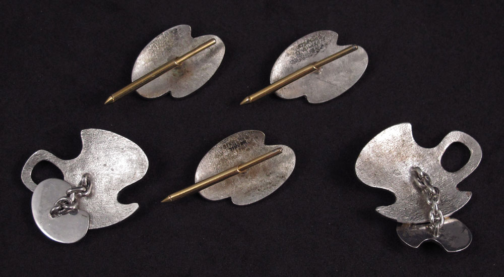 FREEFORM 18K GOLD, STERLING AND RUBY CUFFLINKS AND STUD SET: Sterling and 18K yellow gold cufflink and three shirt studs with a freeform shape. Studs contain six round mixed cut rubies. Weight: .30 Ct. Approx. The rubies are bezel set. Weight: 40.1 grams