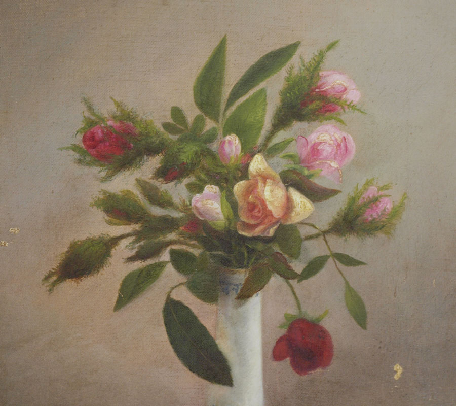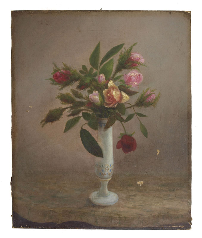 VERY GOOD 19TH CENTURY FLORAL STILL LIFE DEPICTING ROSES AND AN ENAMELED GLASS VASE SIGNED VERSO PEALE, PARIS?: Oil/Canvas, 12'' x 10'', no visible signature.