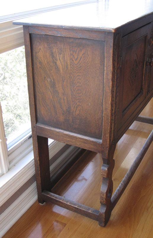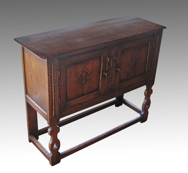 WILLIAM & MARY STYLE CARVED OAK SERVER: 2 carved panel doors with carved and shaped stiles, 4 stretchers, carved front legs. 34'' h. x 41 3/4'' x 15 1/4''.