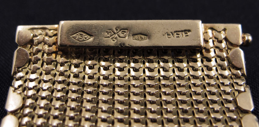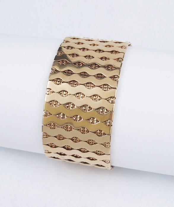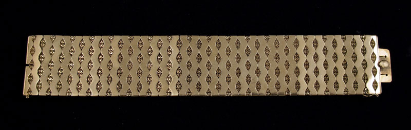 18K FANCY GOLD BRACELET: 18K yellow gold mesh bracelet with segmented zig-zag appliques. 7.25'' in Length. 1.25'' in Width. Locking closure with figure eight safety clasp. Weight: 91.5 grams. Well marked 750, hallmark and signed Revete.