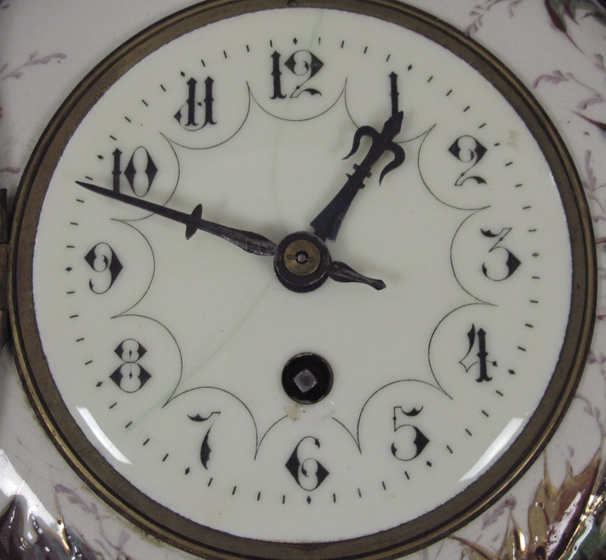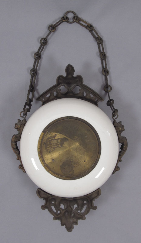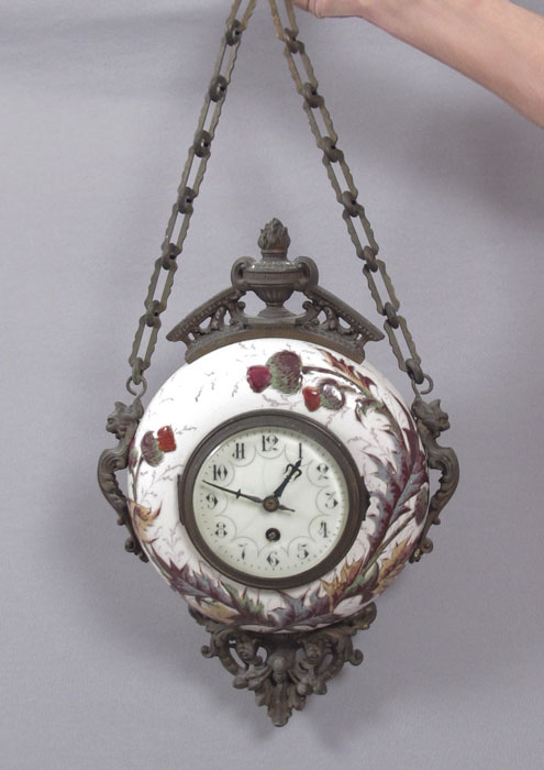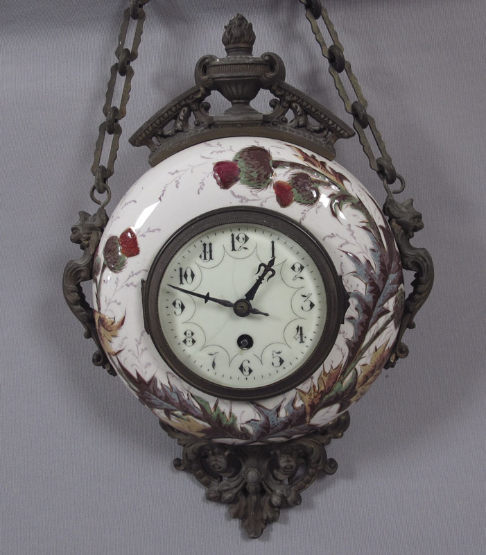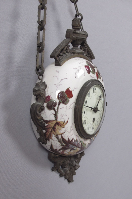 FRENCH PORCELAIN HANGING CLOCK: Porcelain case with raised thistle design. Cast metal accents and mounts. Beveled glass crystal with porcelain face, Arabic numerals. Unknown maker signed movement, anchor in shield with star above. 14'' x 10'' x 4 1/4'' excluding chain.